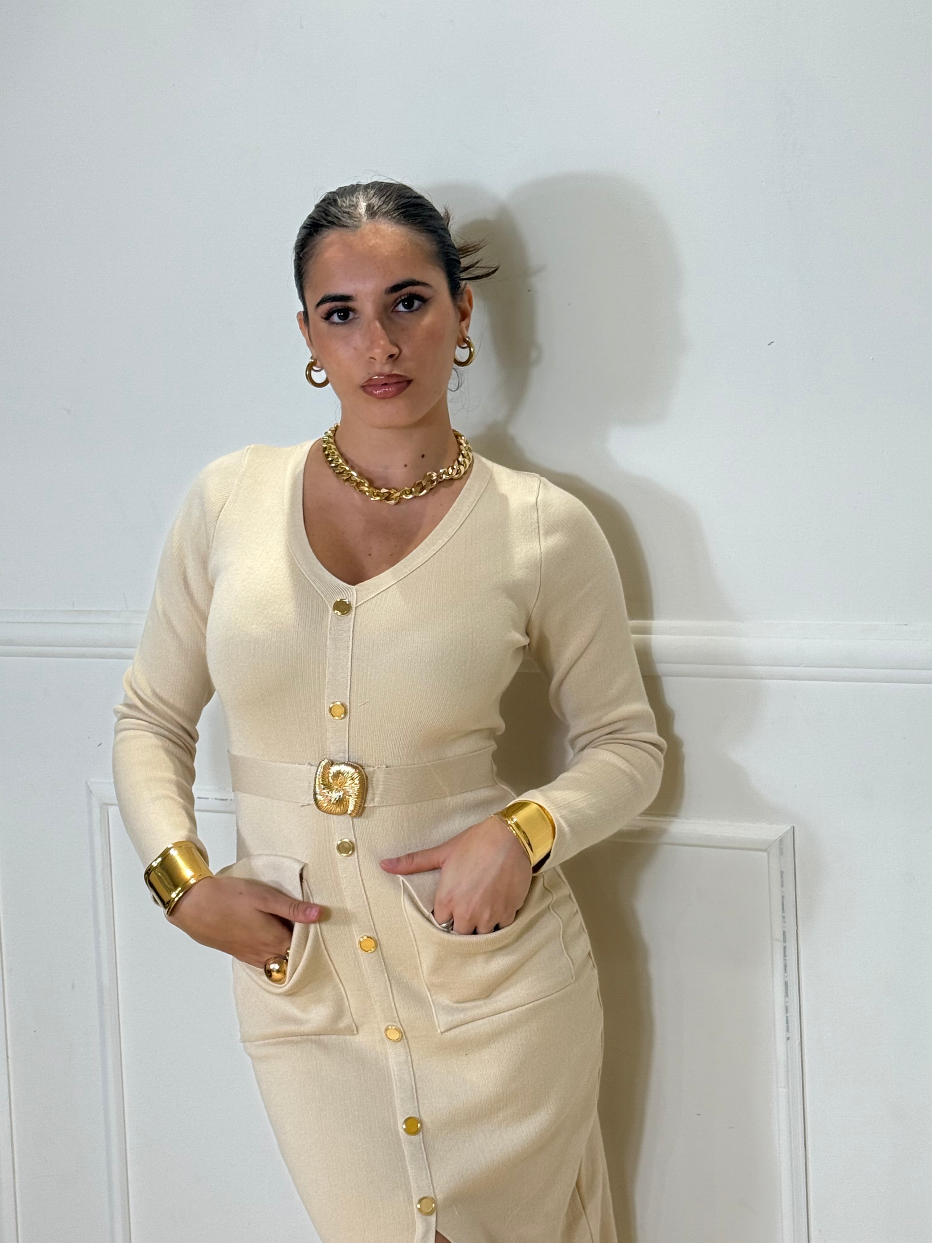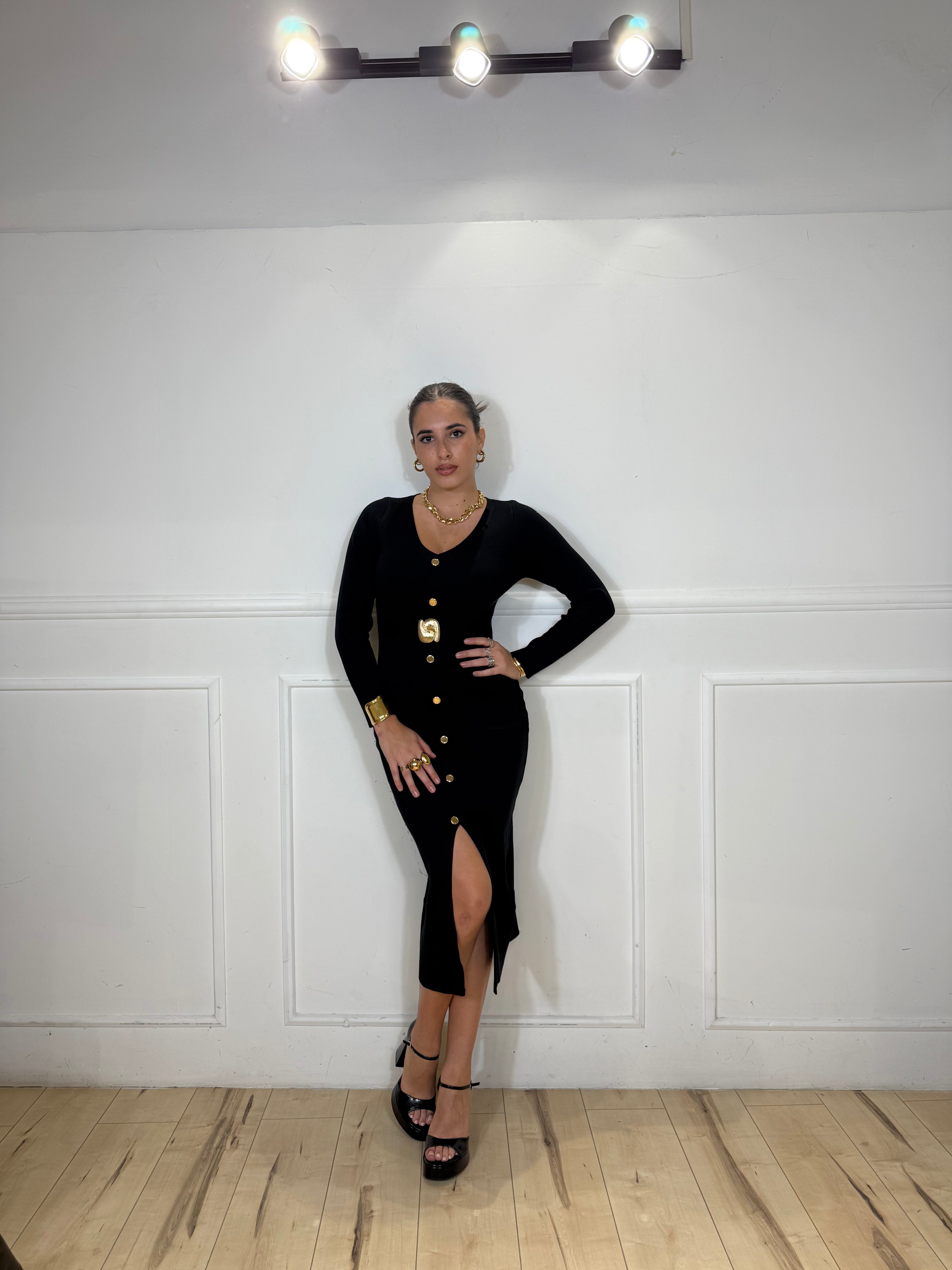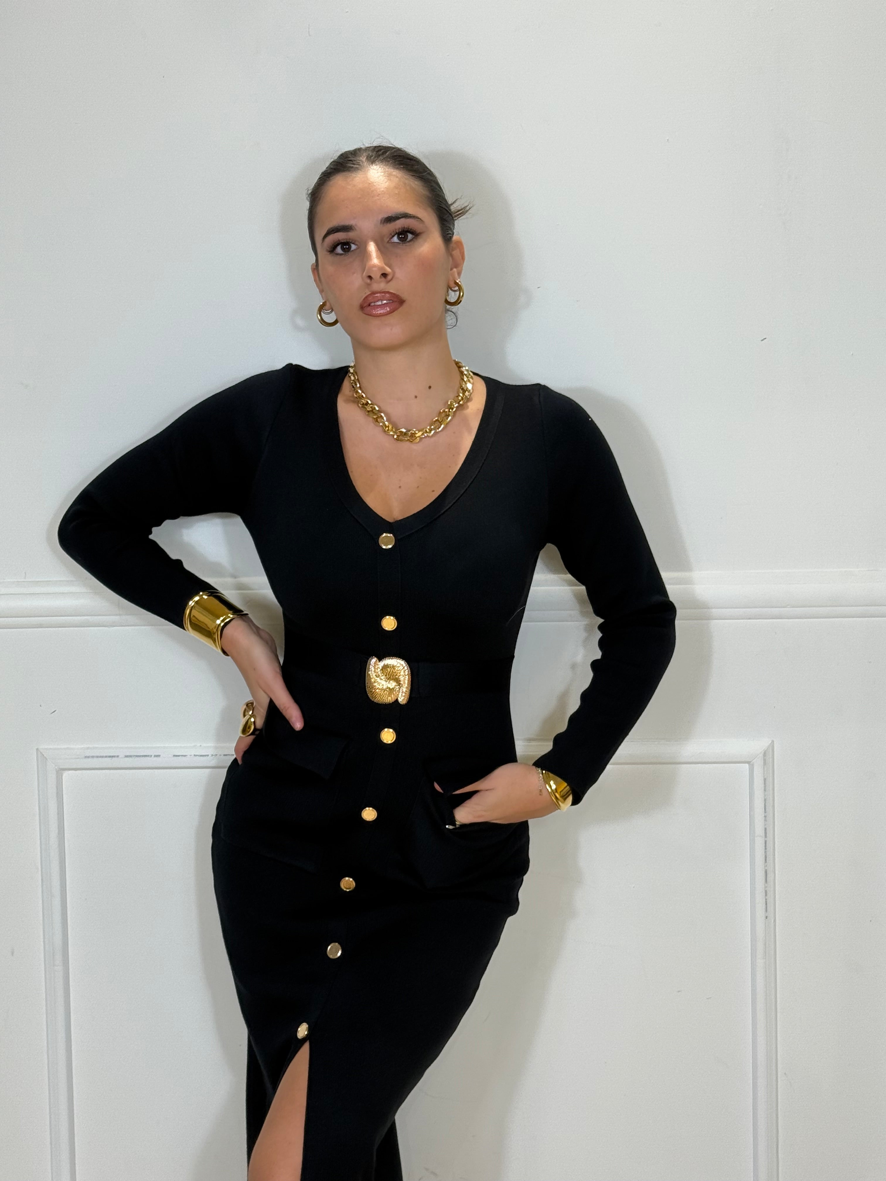 Abito tubino in lana rasata con dettagli oro, disponibile in taglia unica.