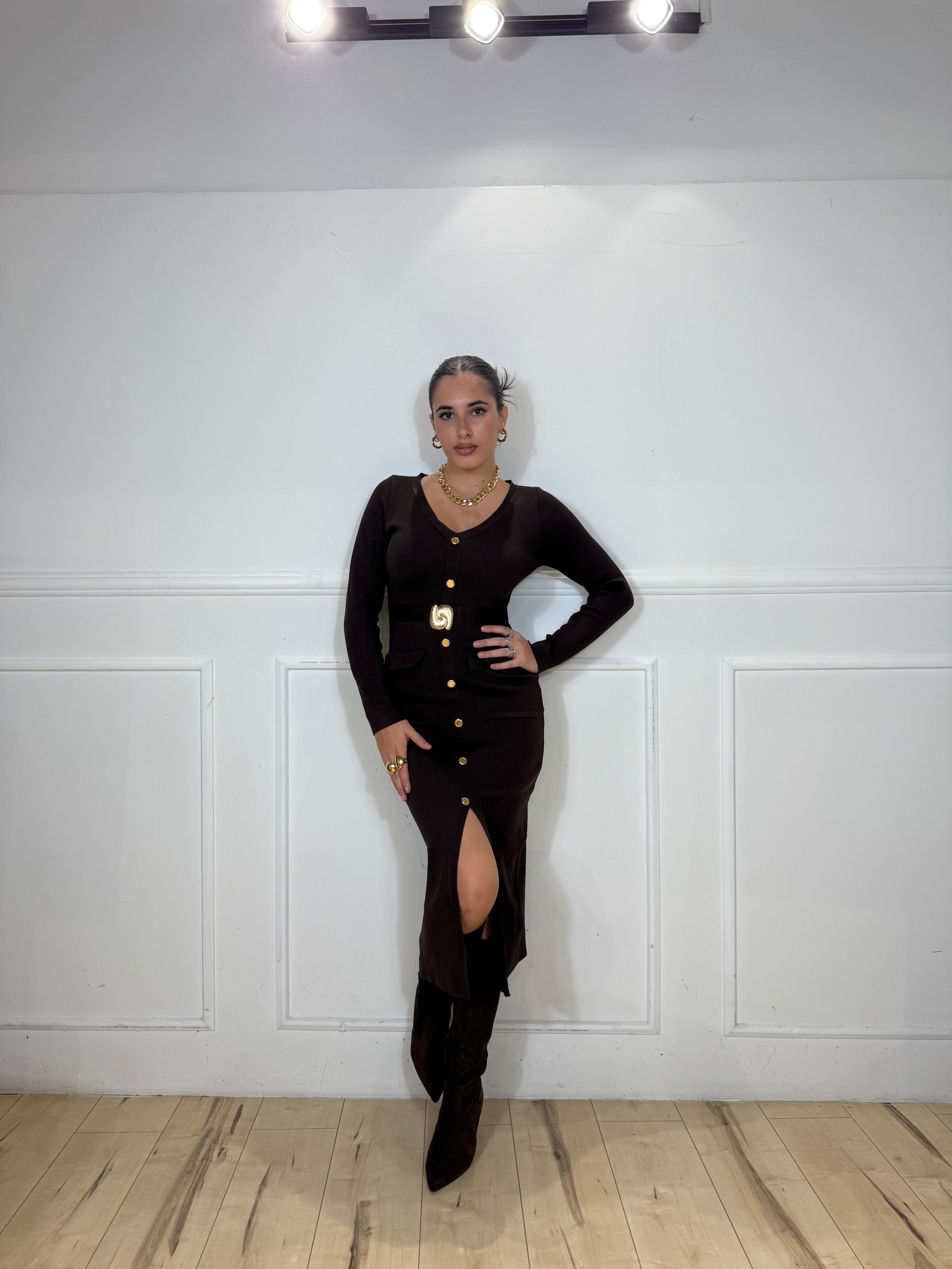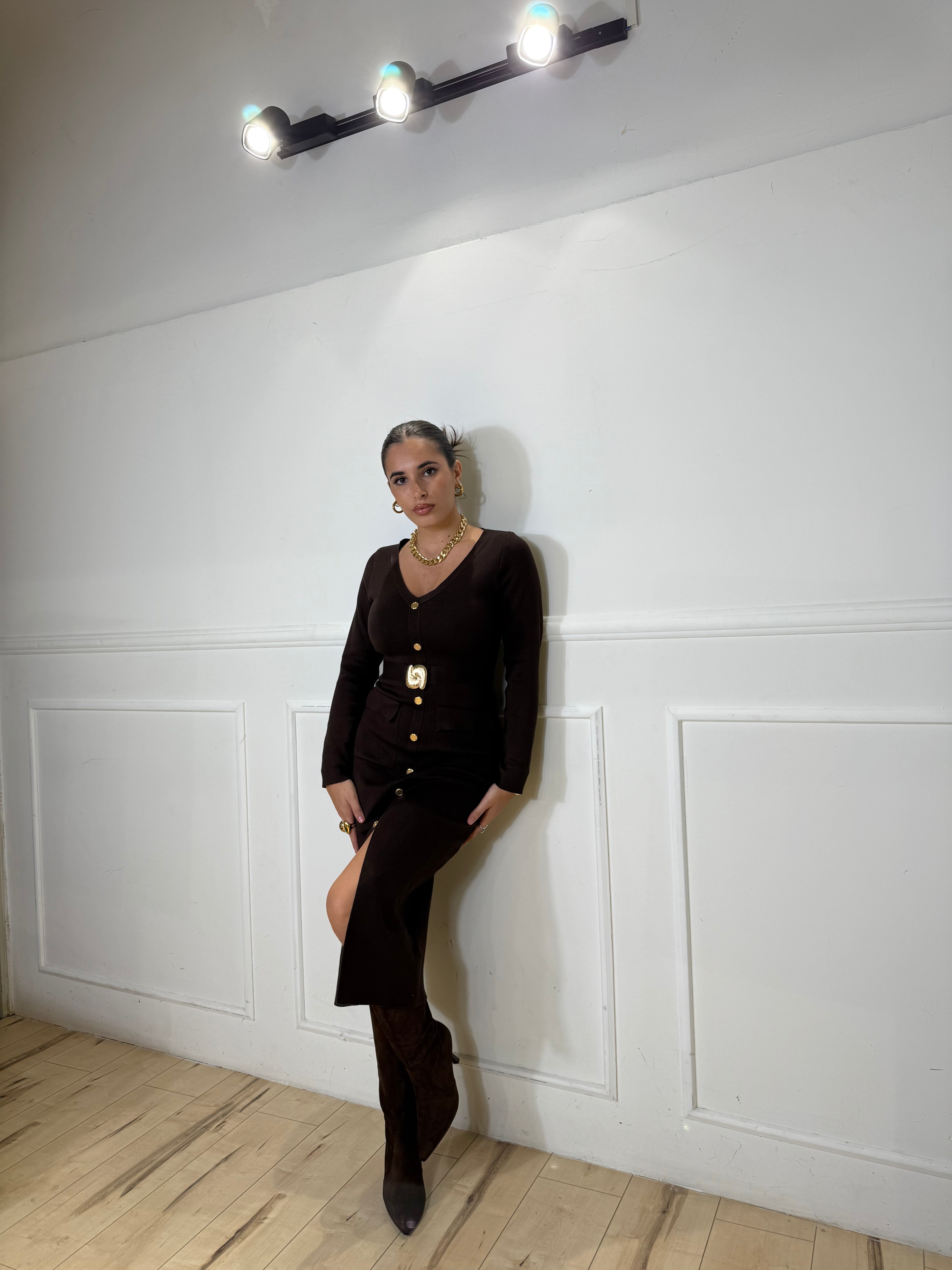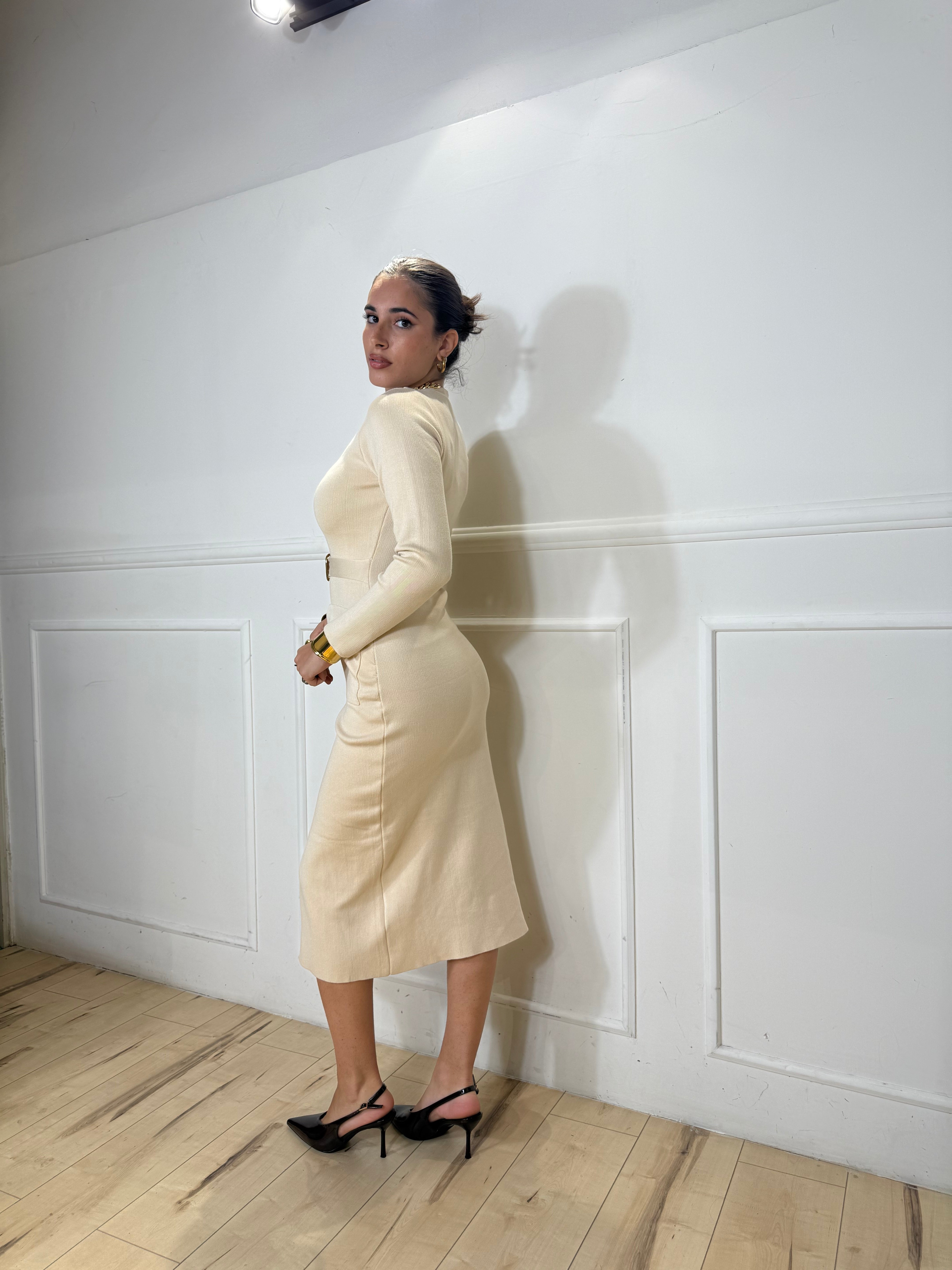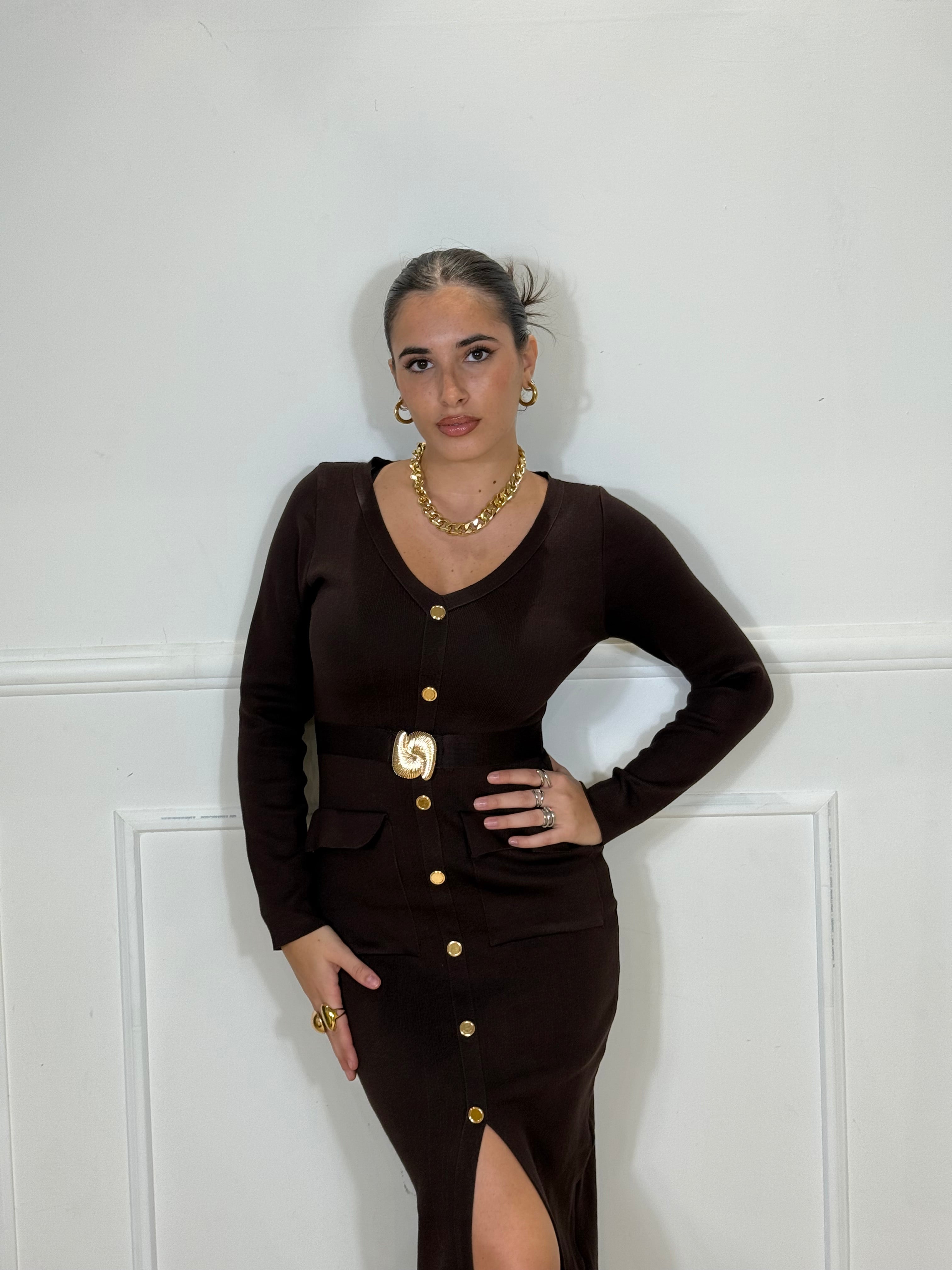 Abito tubino in lana rasata con dettagli oro, disponibile in taglia unica.
