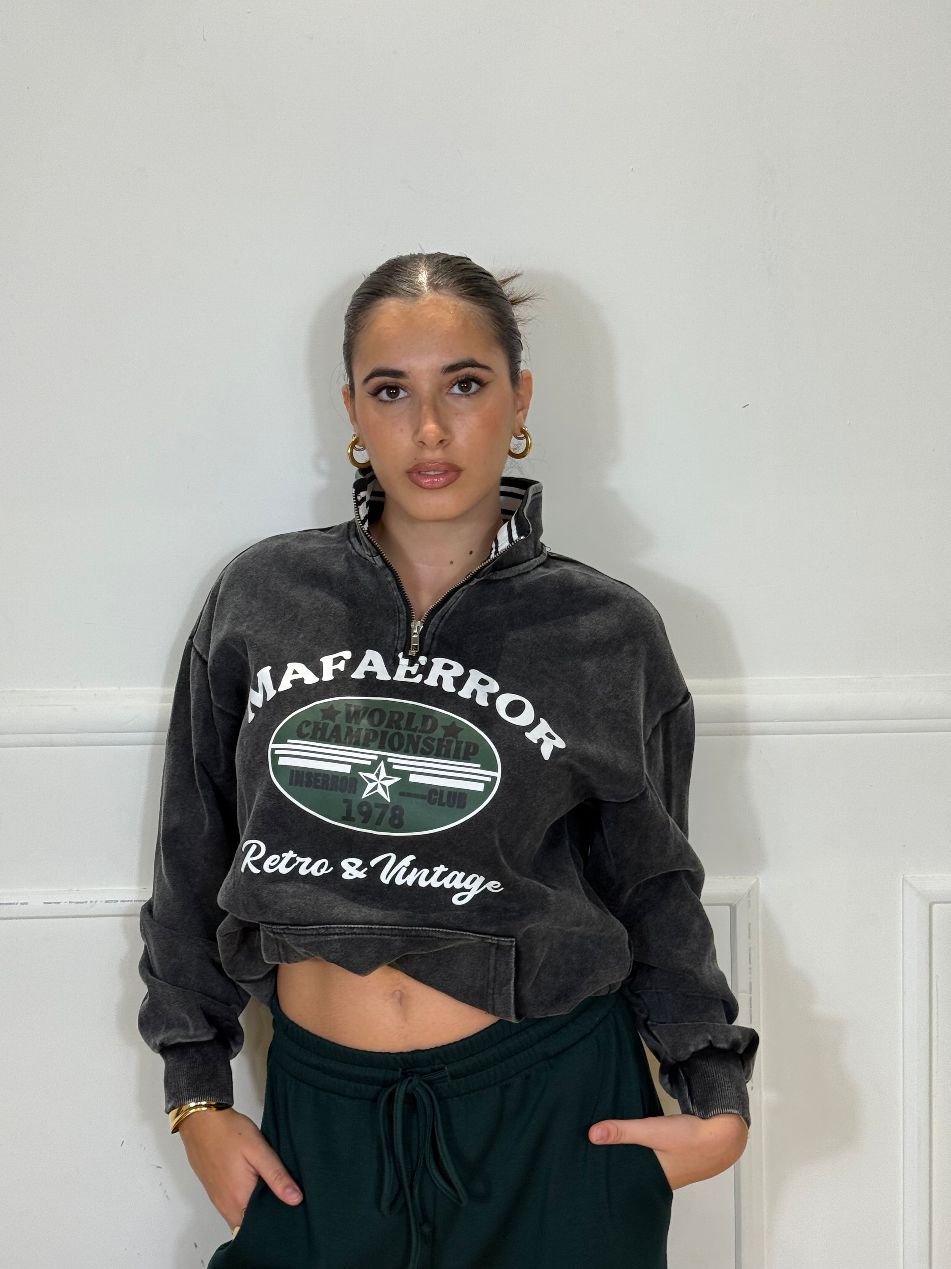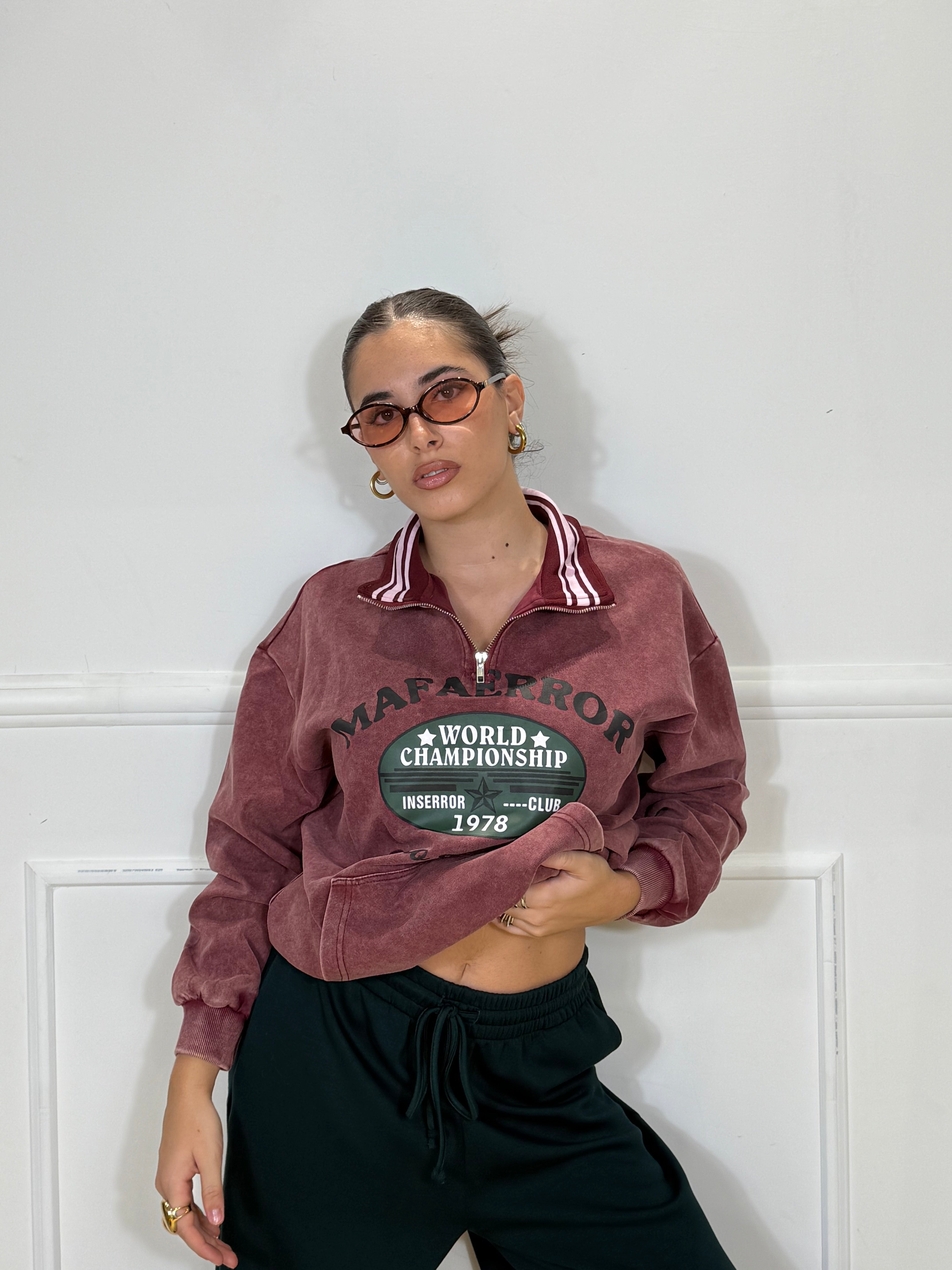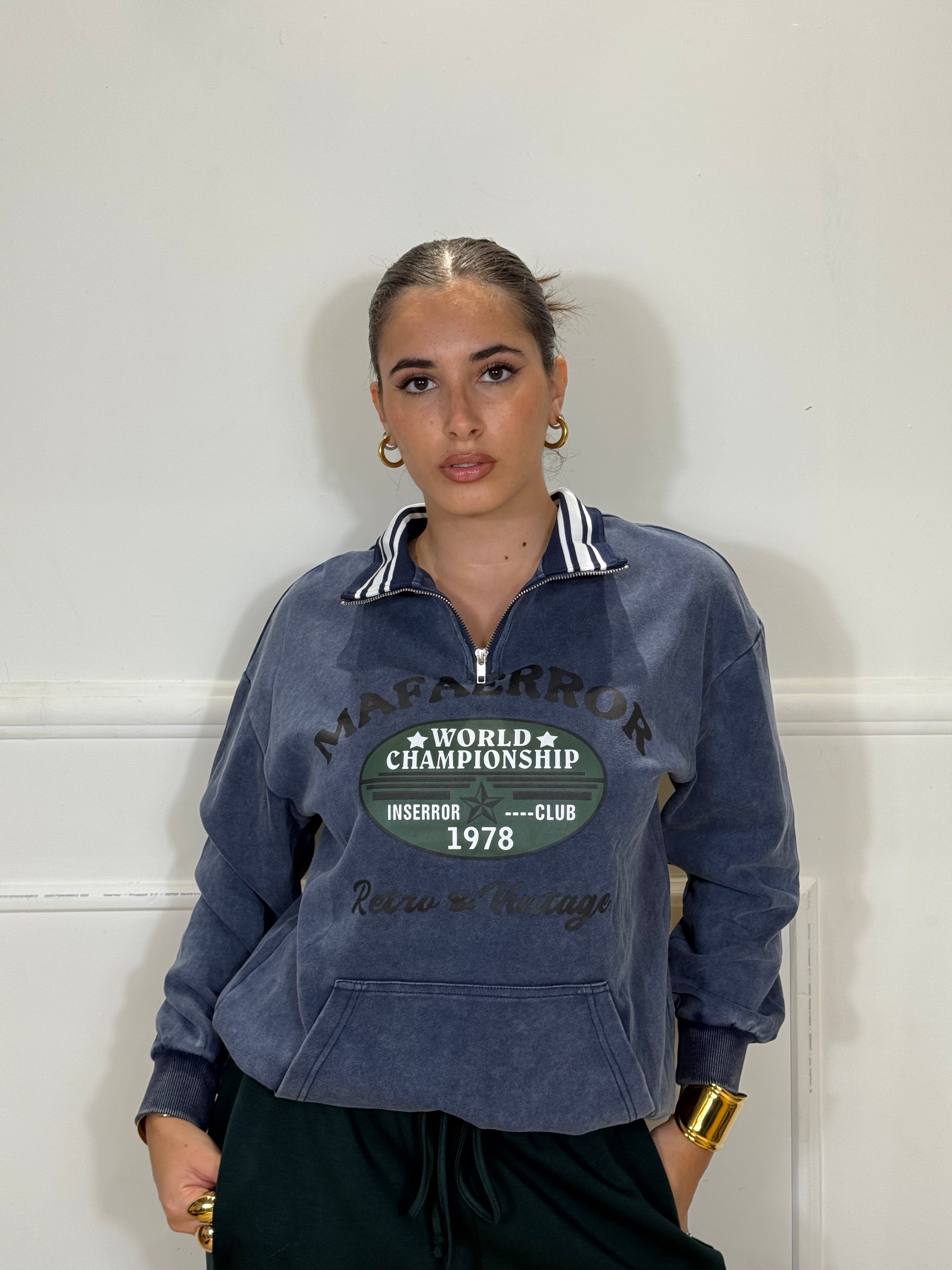 Felpa over Size con zip ed elastico in vita e sui polsi, disponibile in taglia unica.