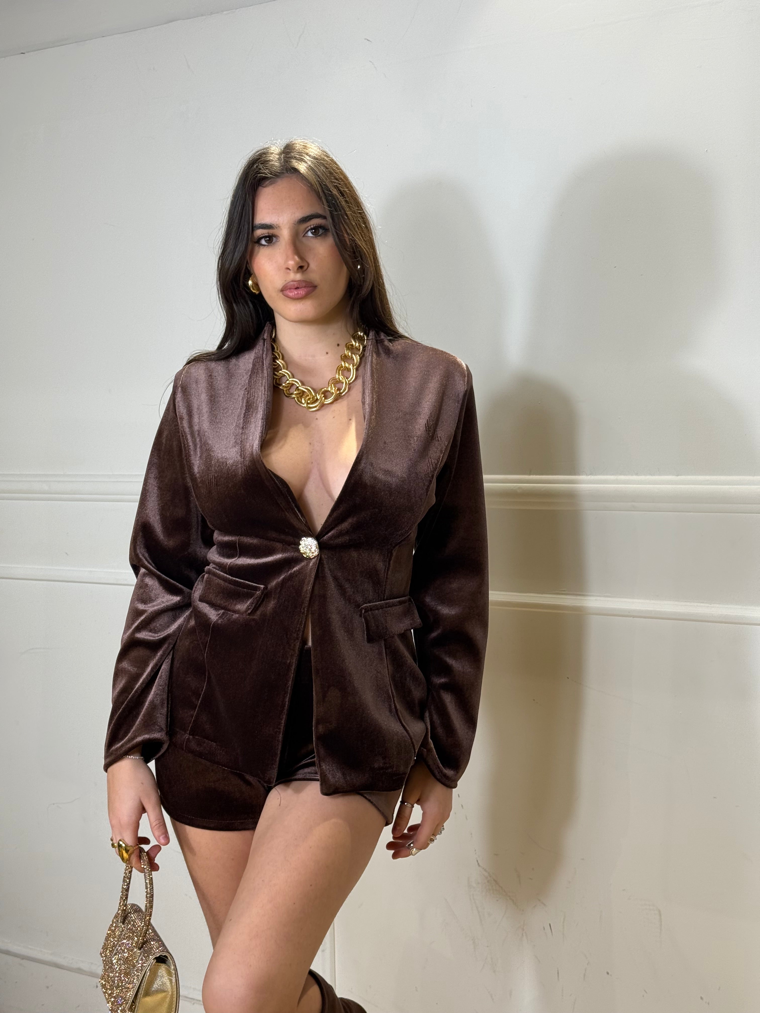 Coordinato in conigli composto da giacca con bottone e coulotte in tessuto elastico. Disponibile in taglia unica, veste bene fino ad una taglia 46.