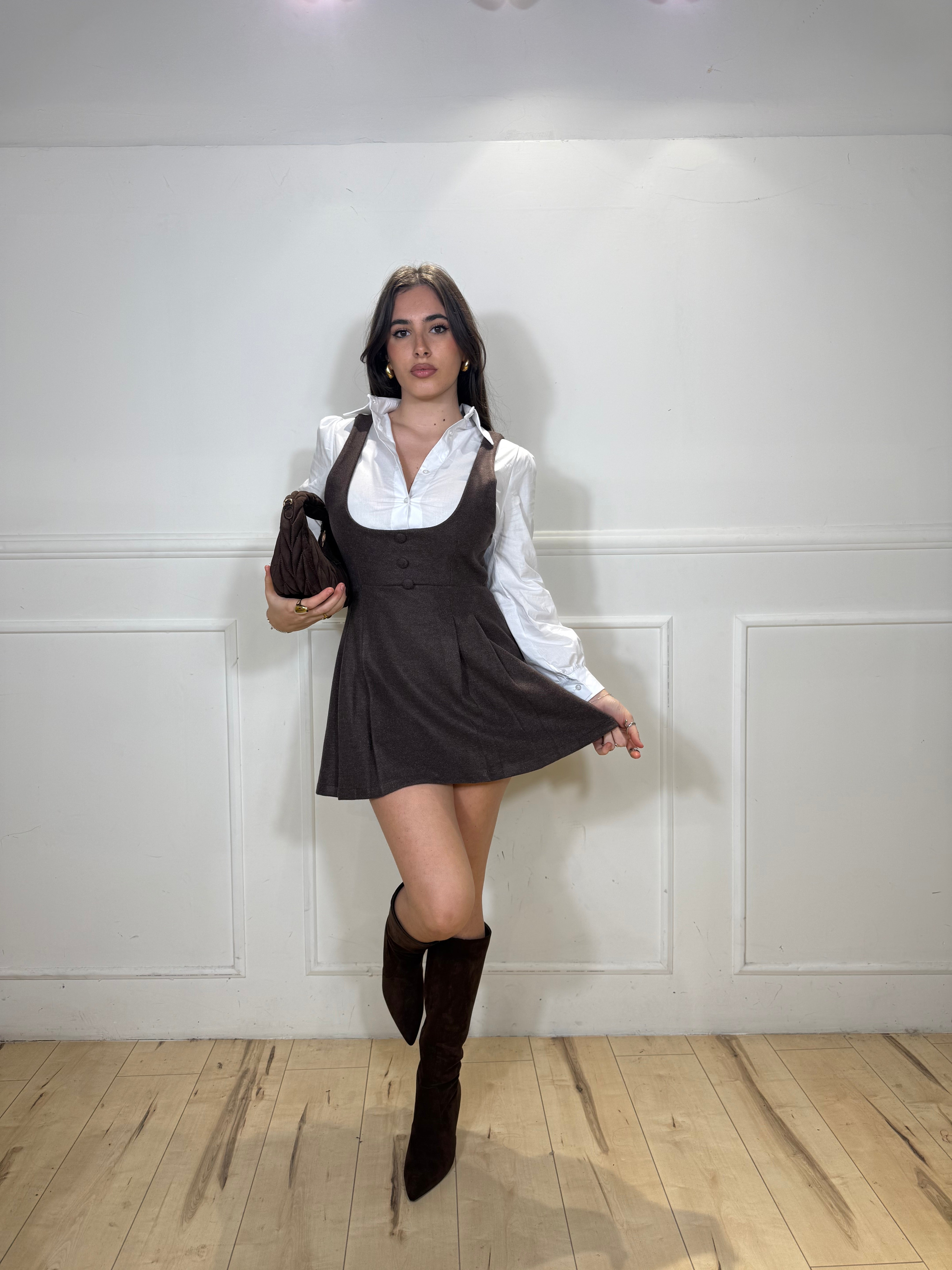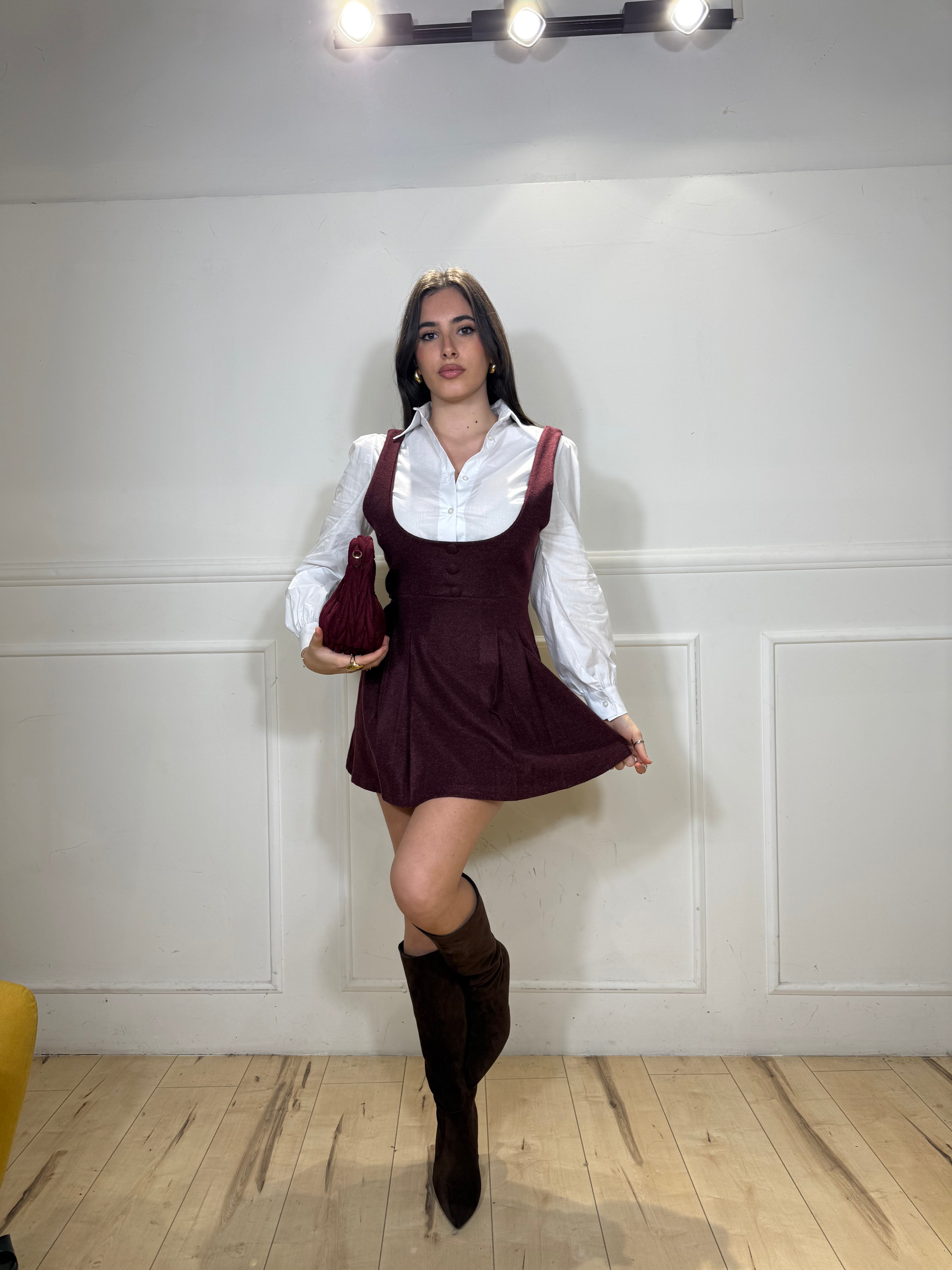 Coordinato composto da camicia in cotone e salopette in lana. Disponibile in taglia unica, veste bene fino ad una taglia 44.