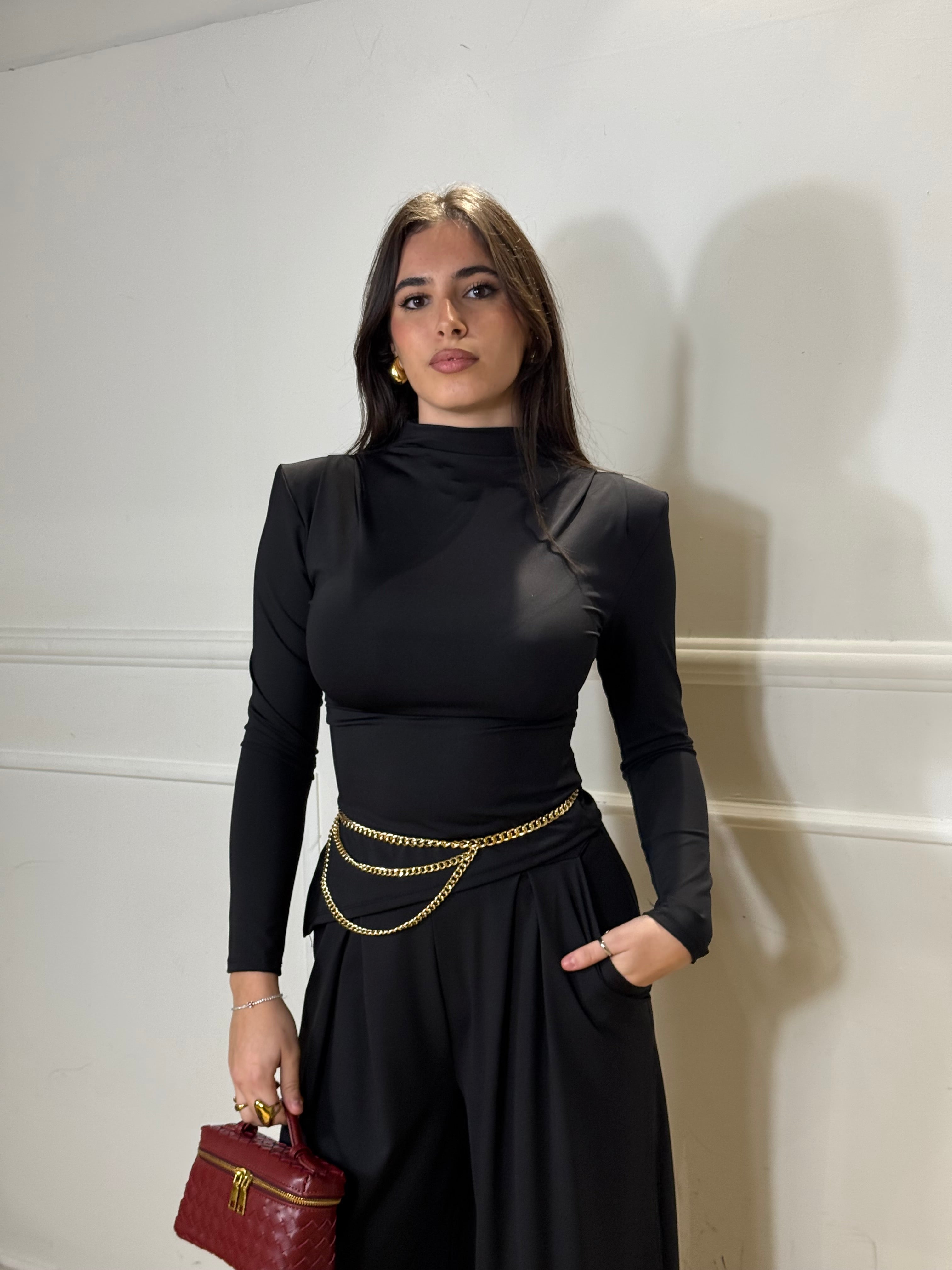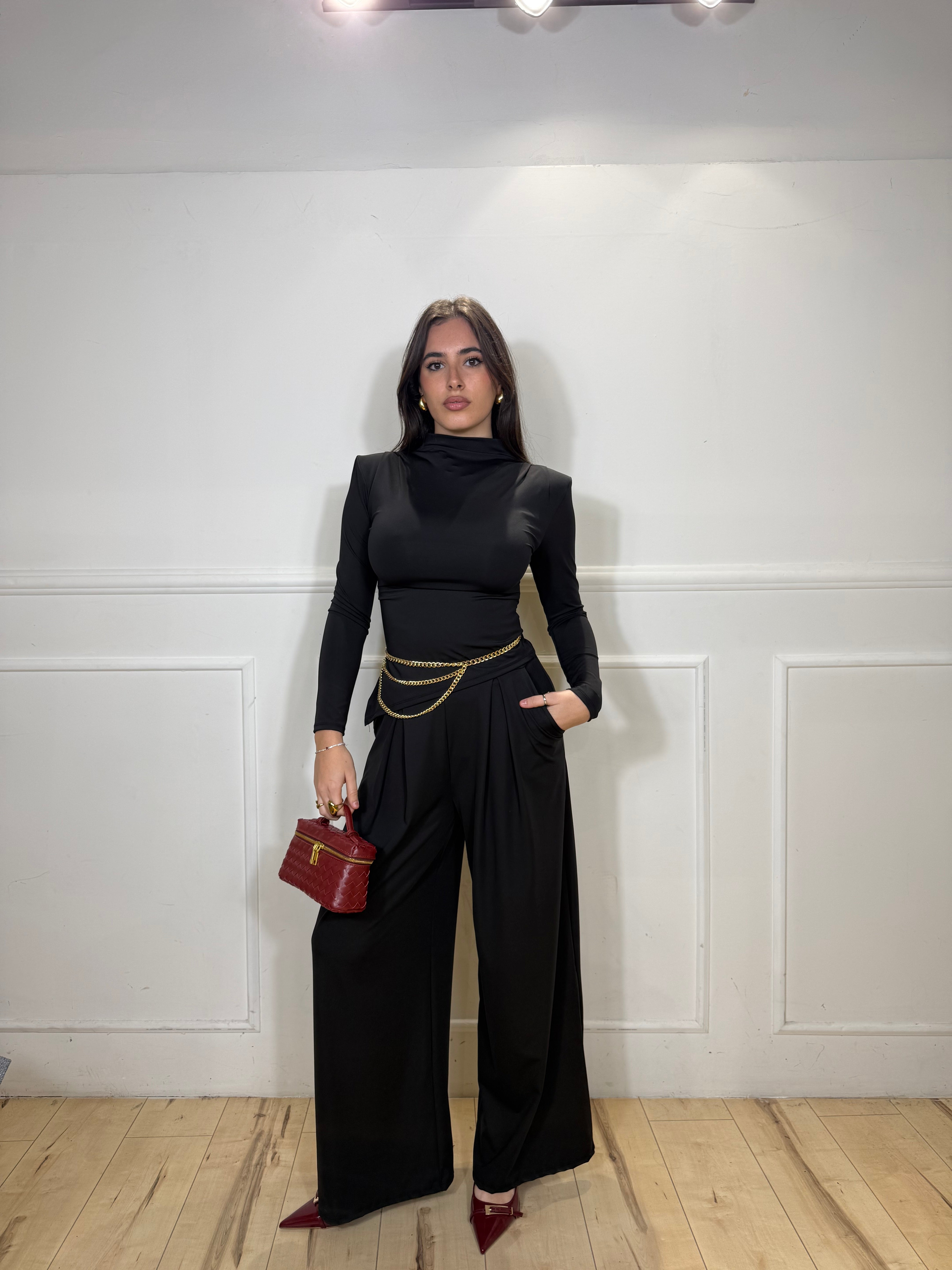 Coordinato in lycra coniato da maglia con spalline e pantalone dritto con elastico in vita. Disponibile in taglia unica, veste bene fino ad una taglia 48.