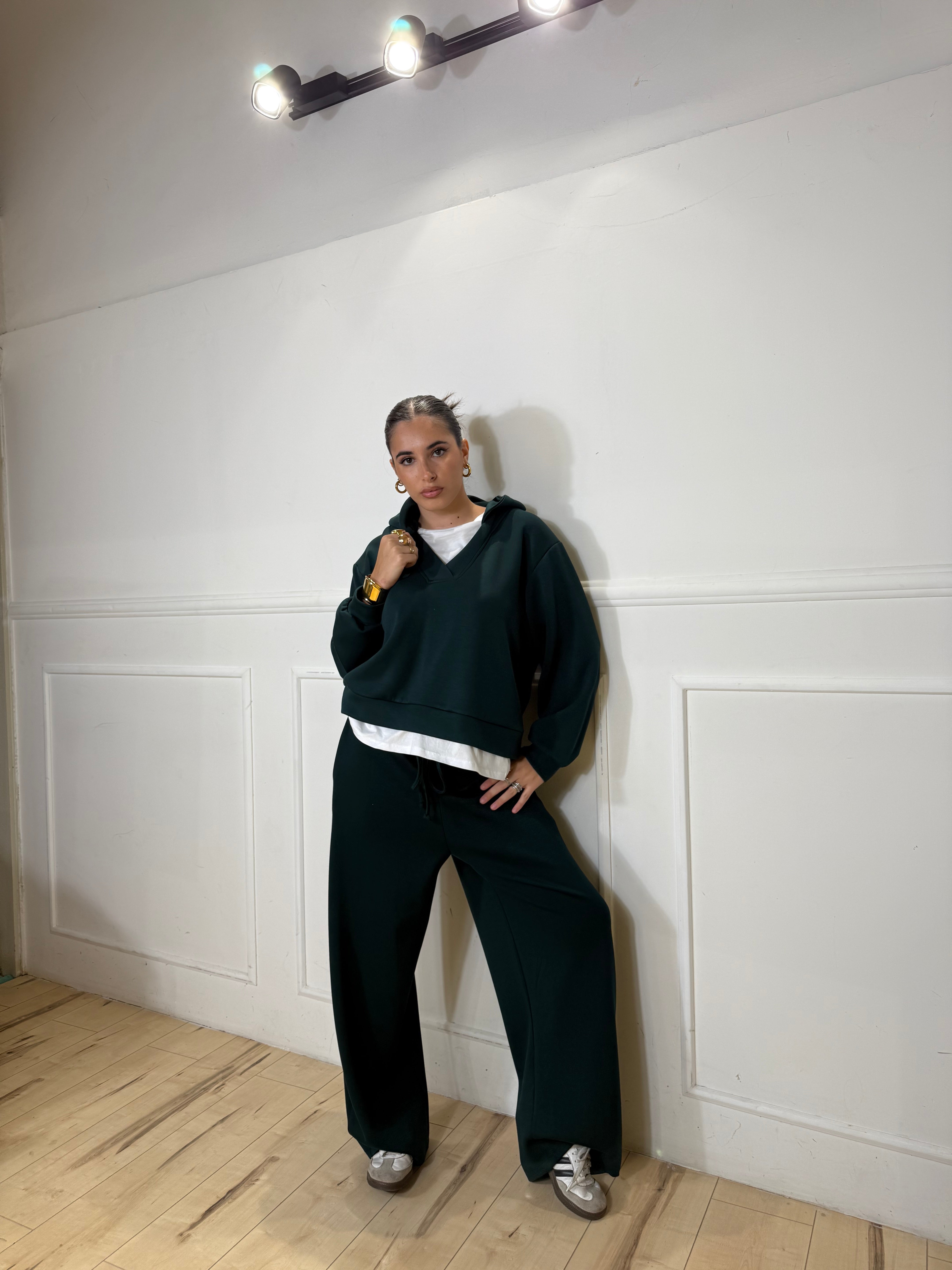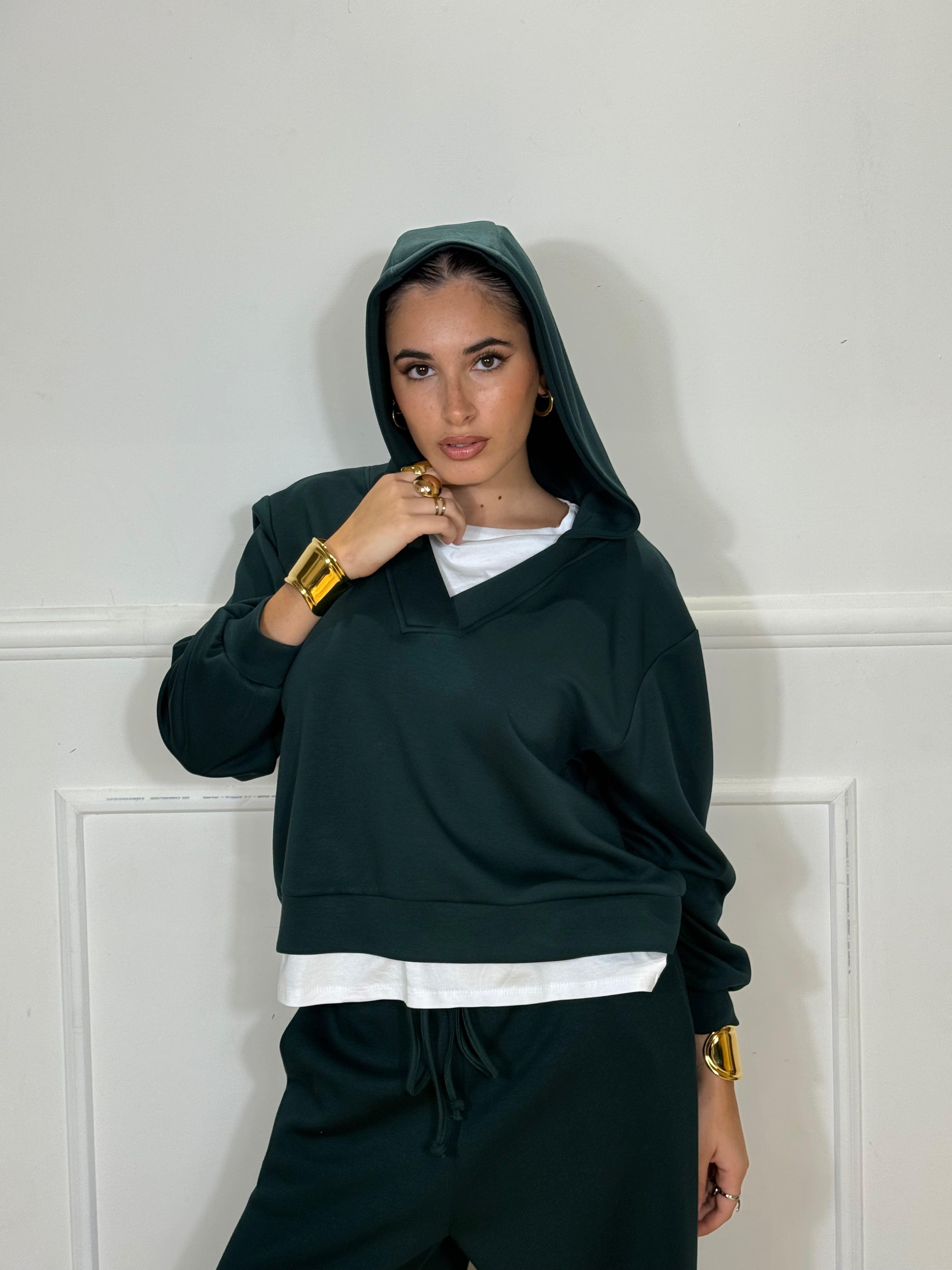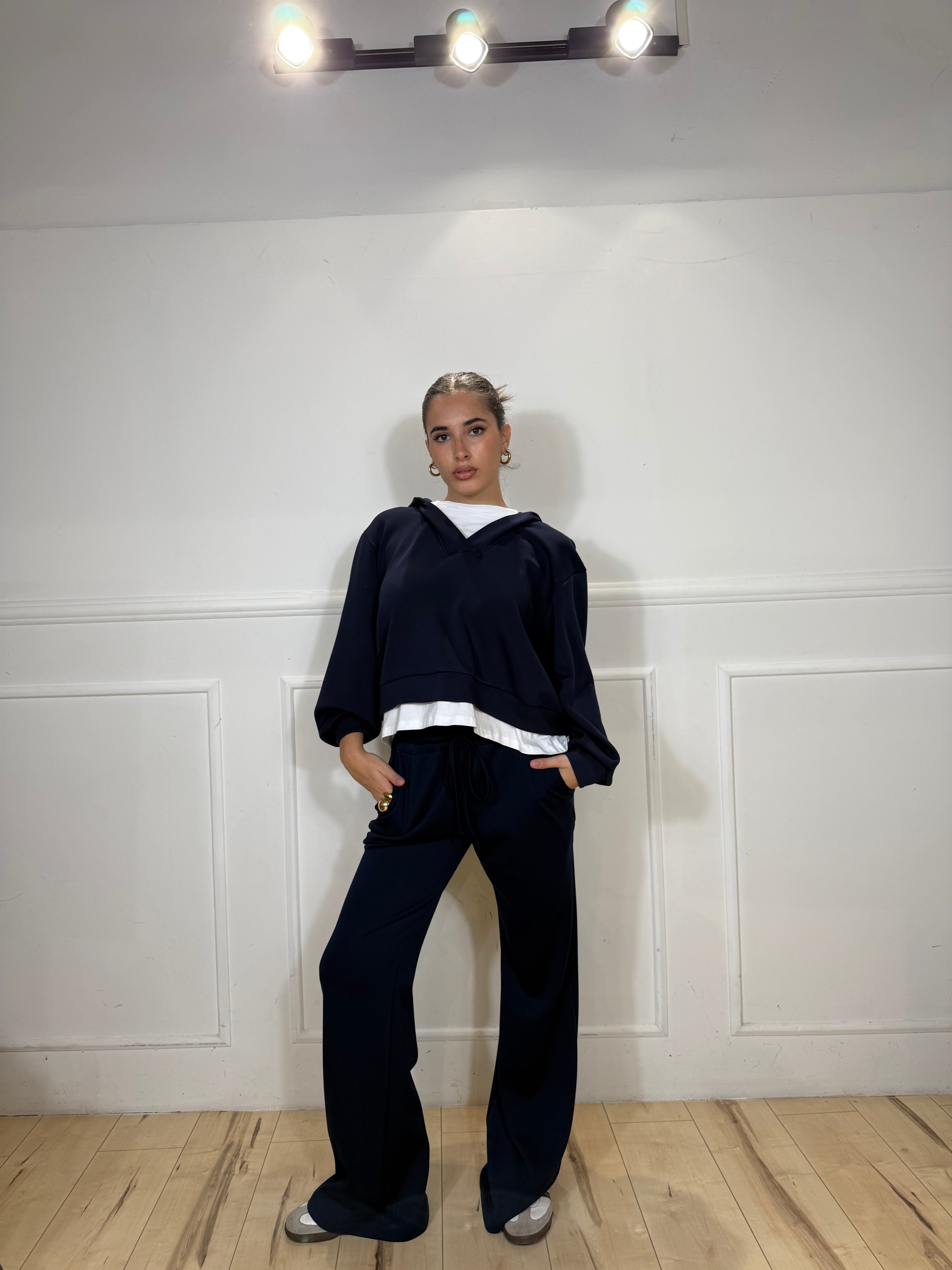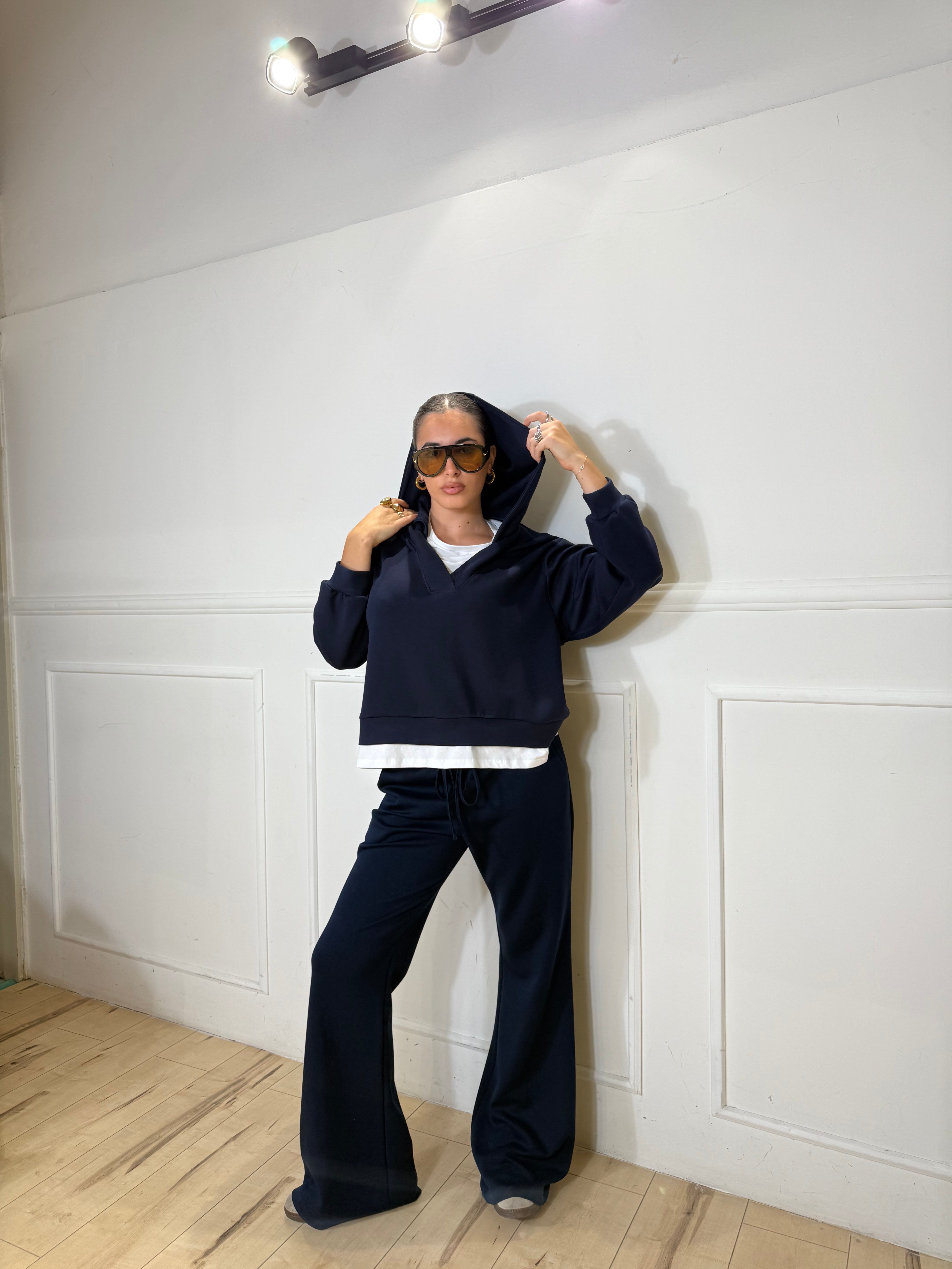 Coordinato molto elastico con felpa con cappuccio e pantalone con elastico in vita, disponibile in taglia unica.