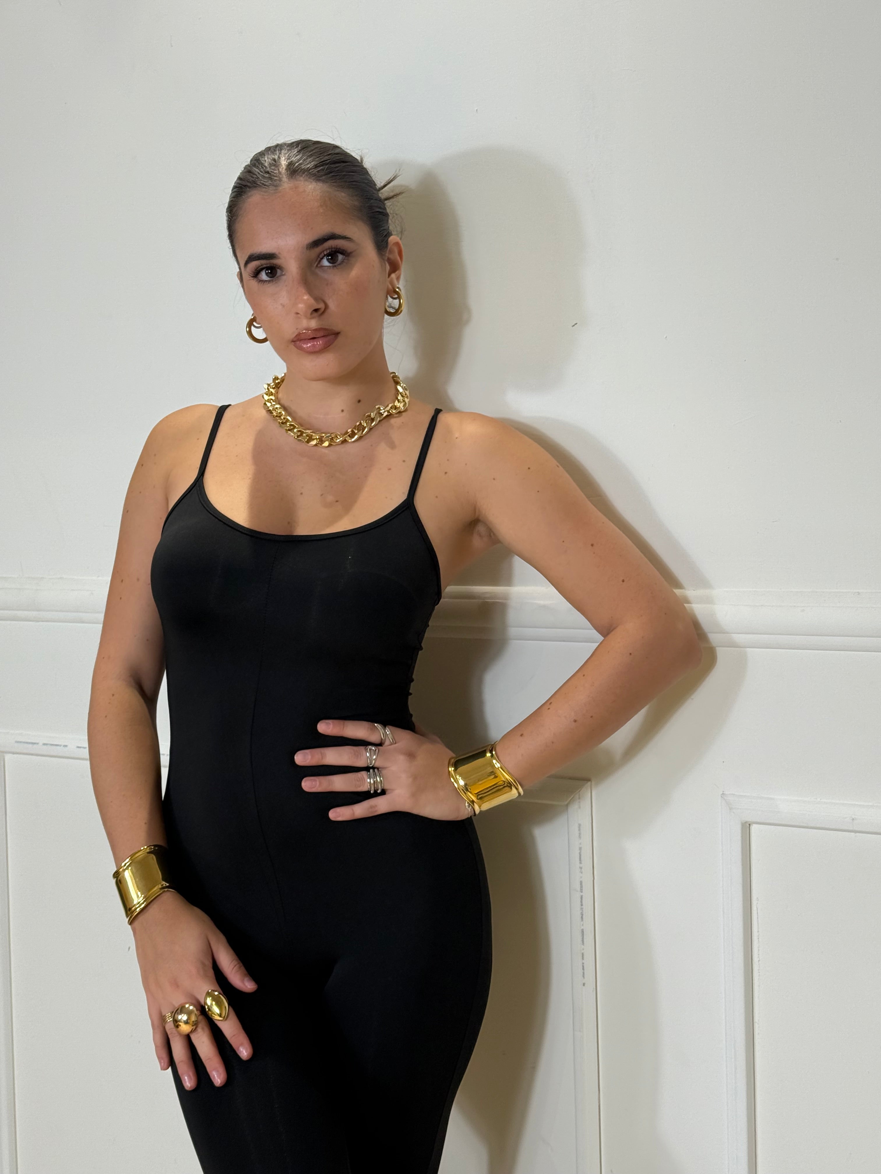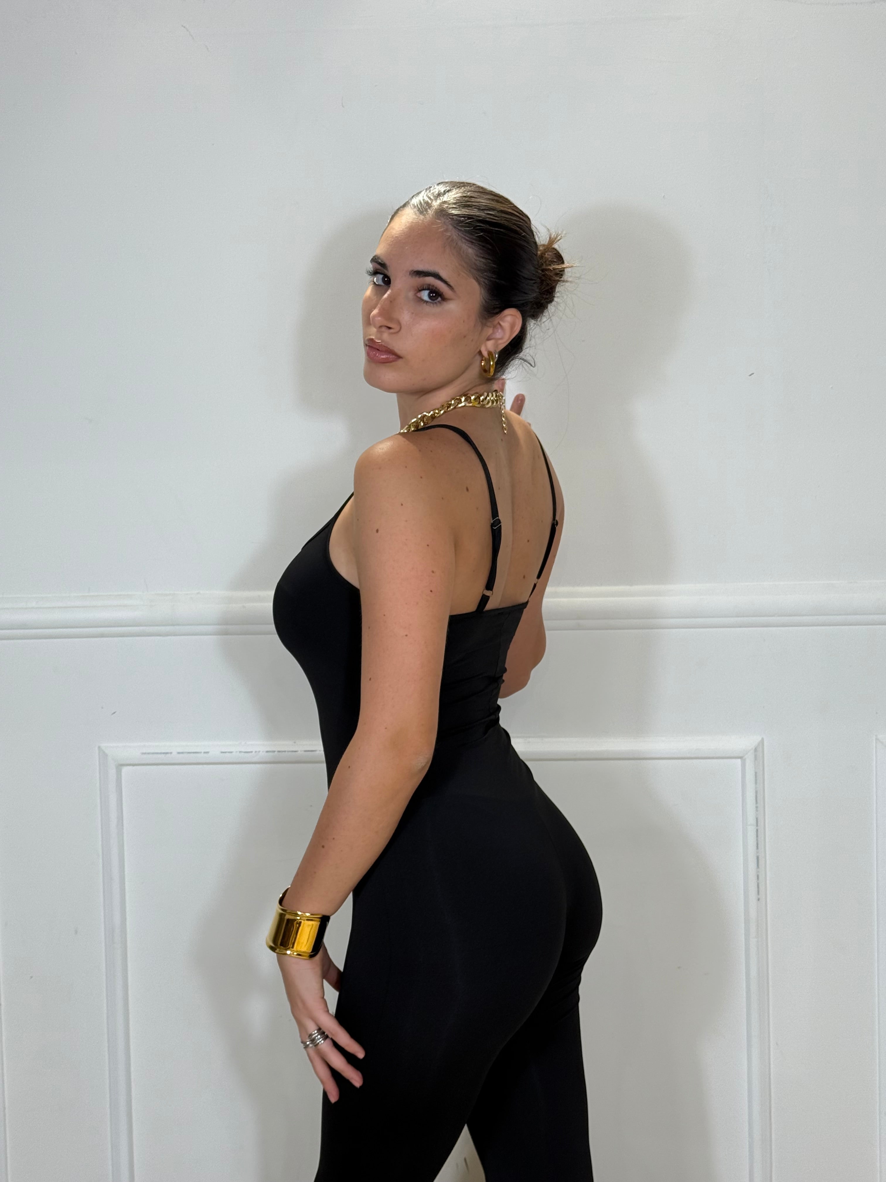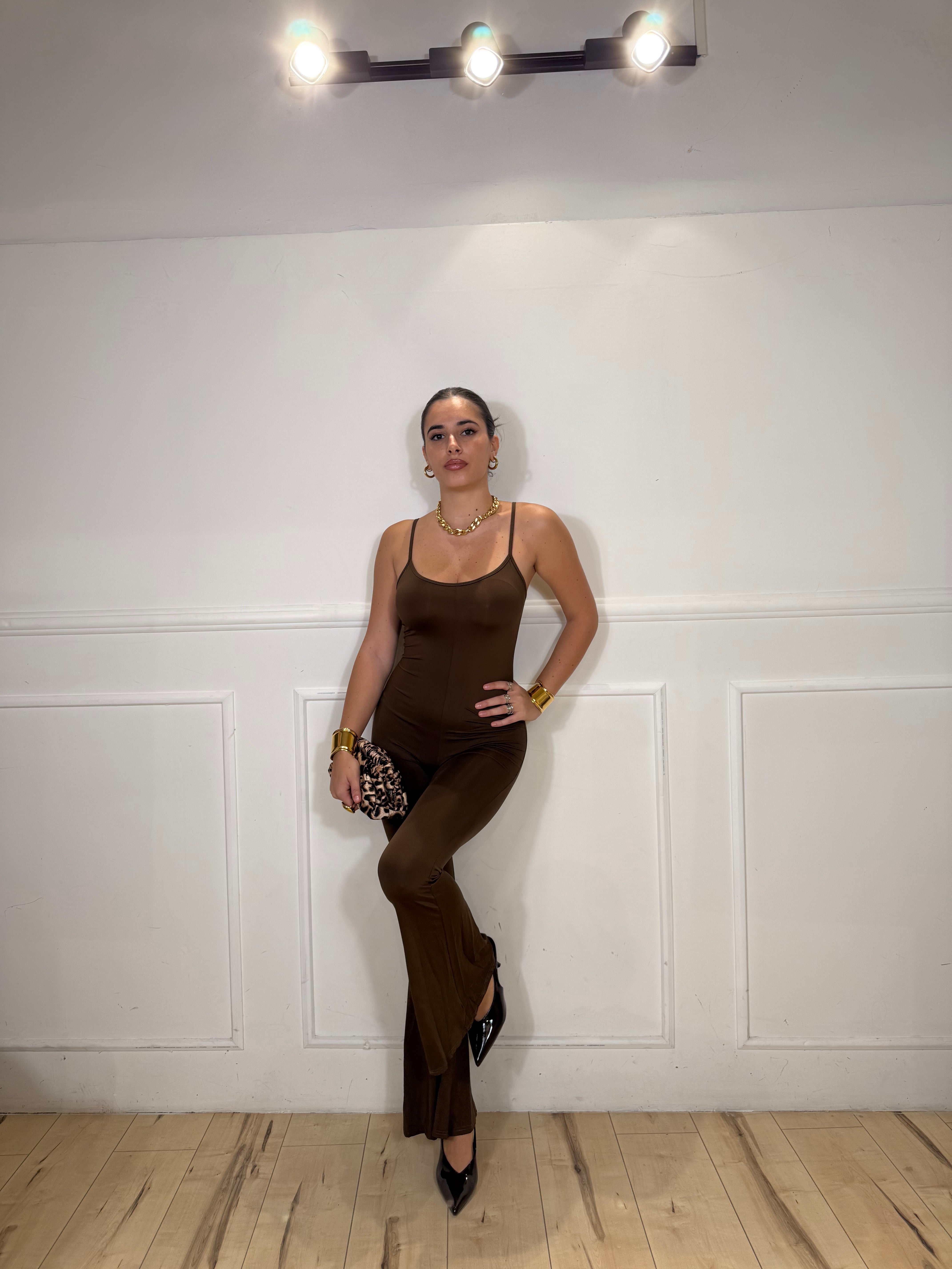 Tuta a zampa in tessuto molto elastico con bretelle regolabili, disponibile in taglie.