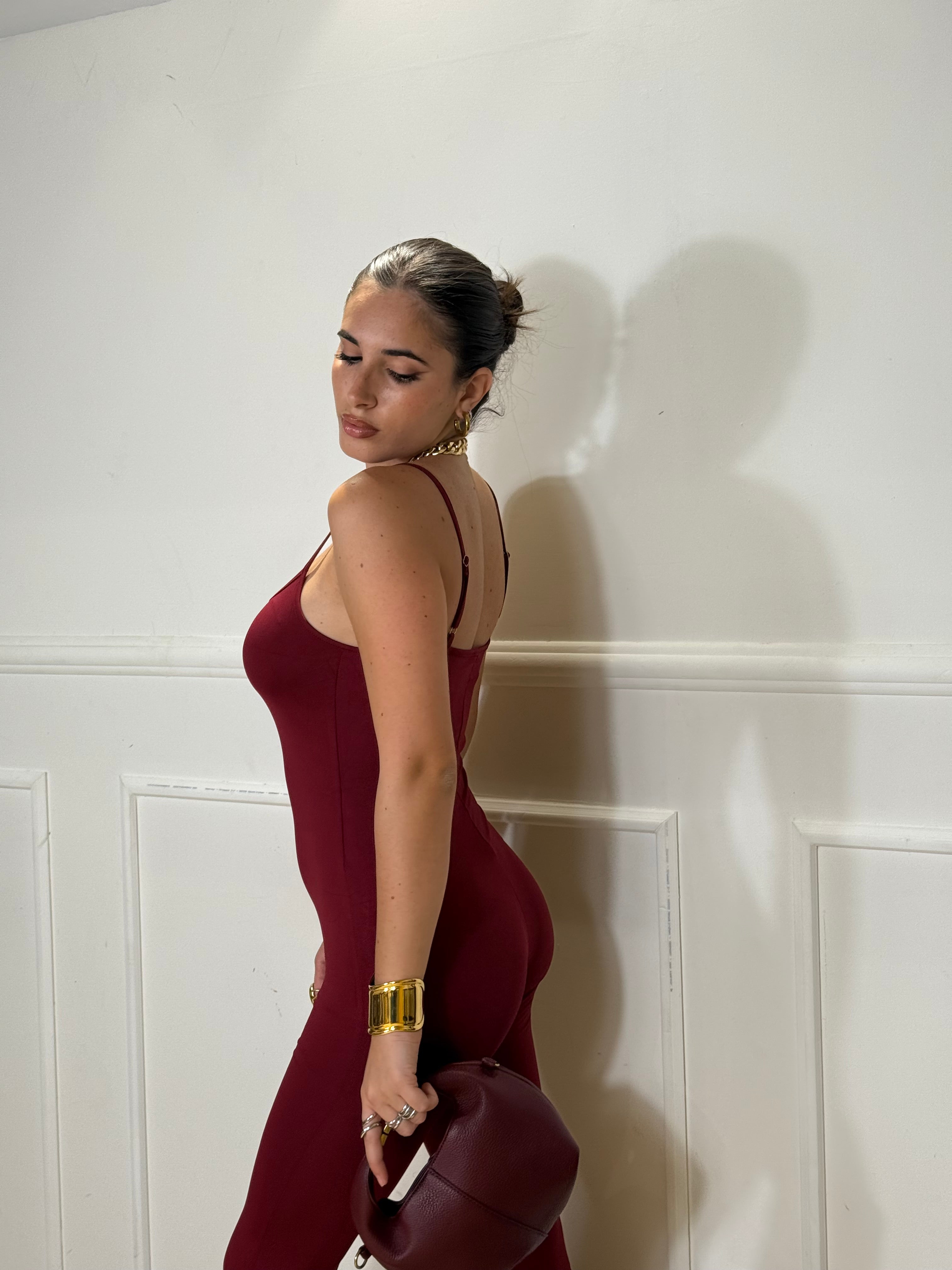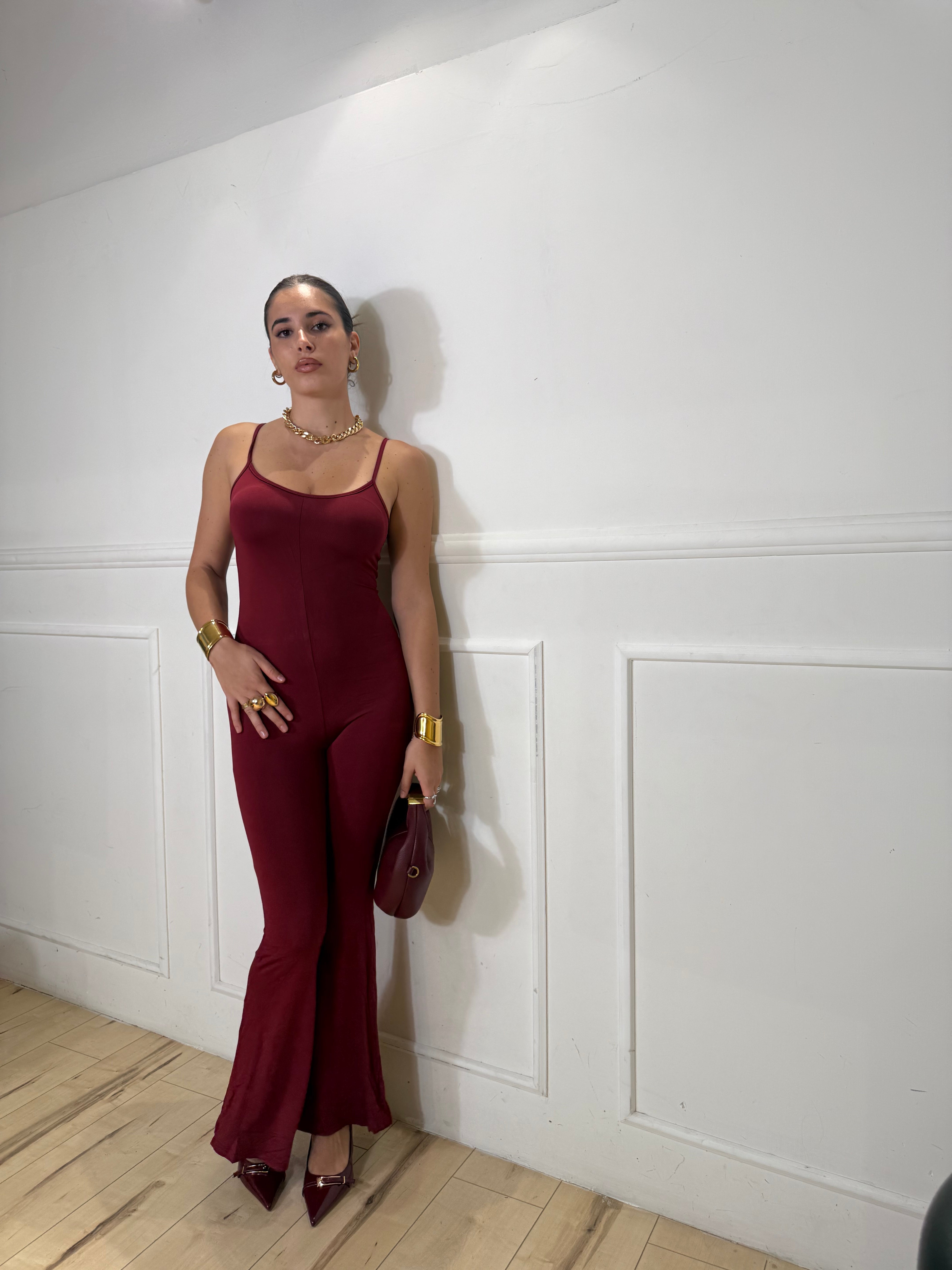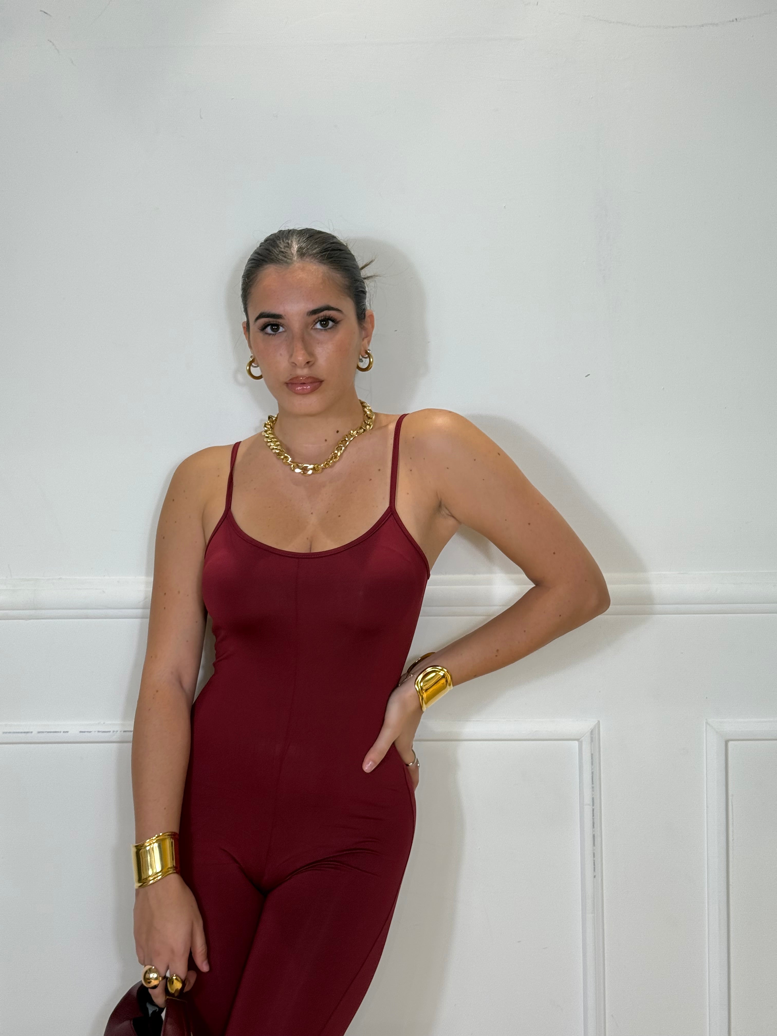 Tuta a zampa in tessuto molto elastico con bretelle regolabili, disponibile in taglie.