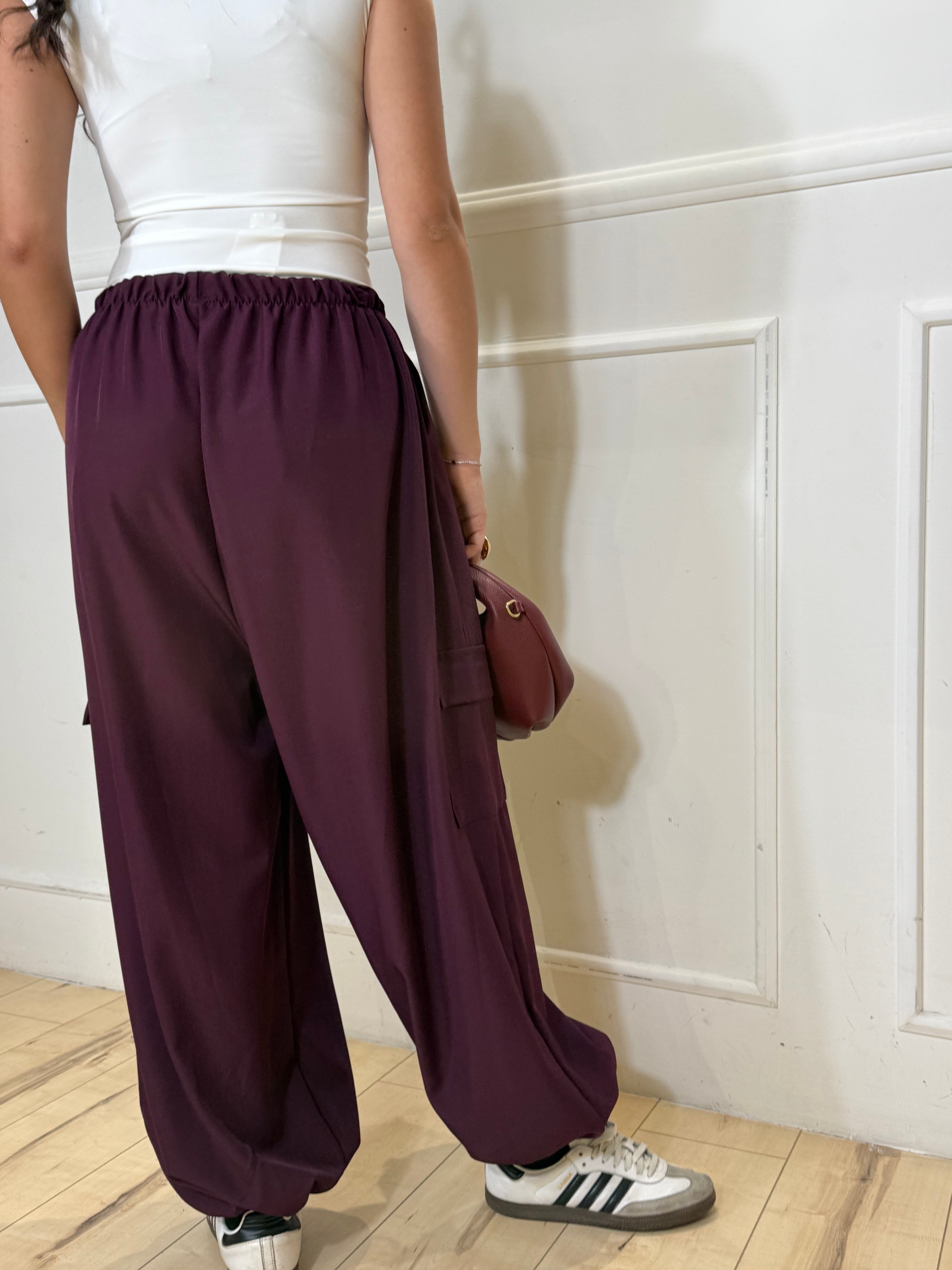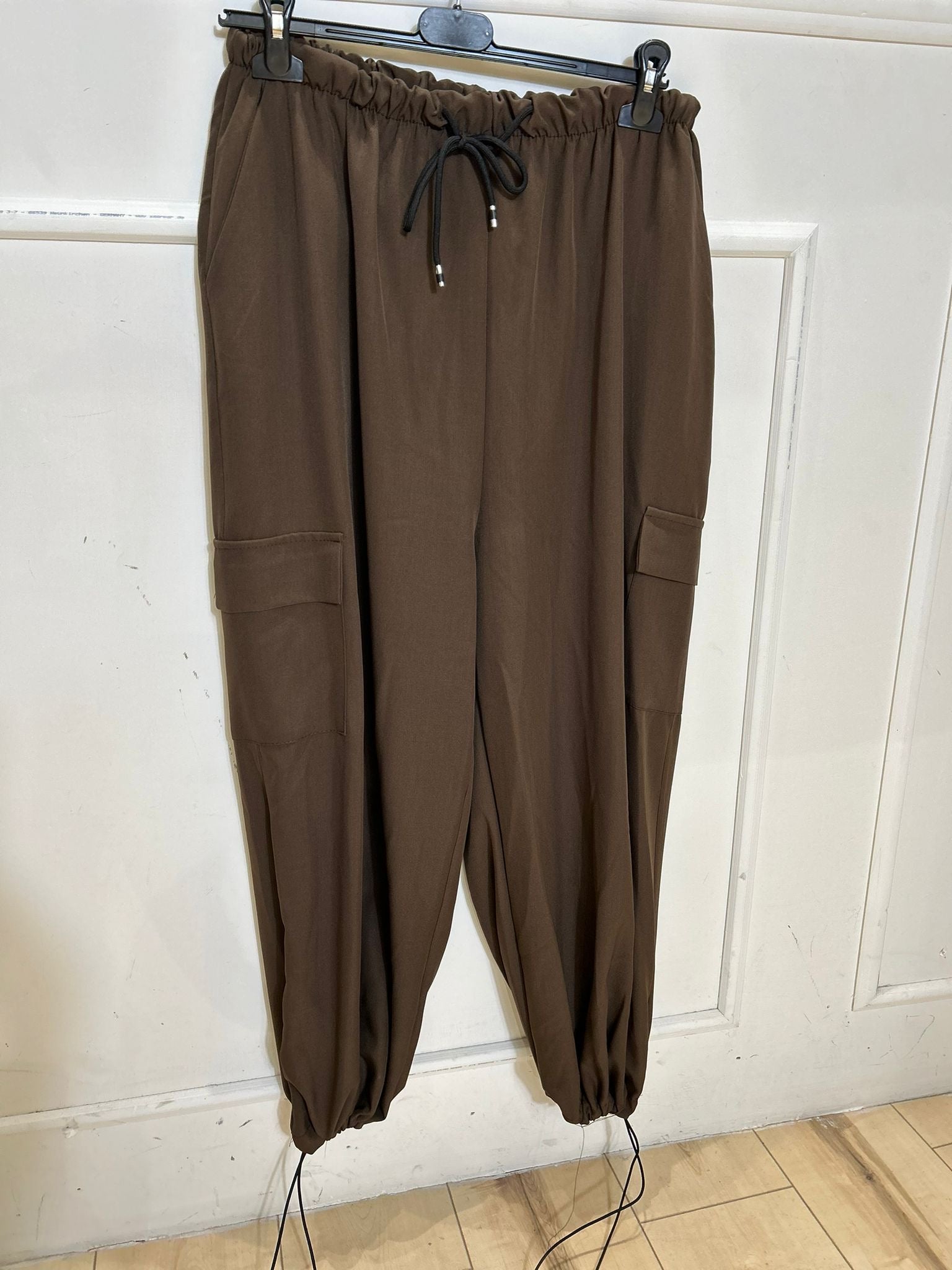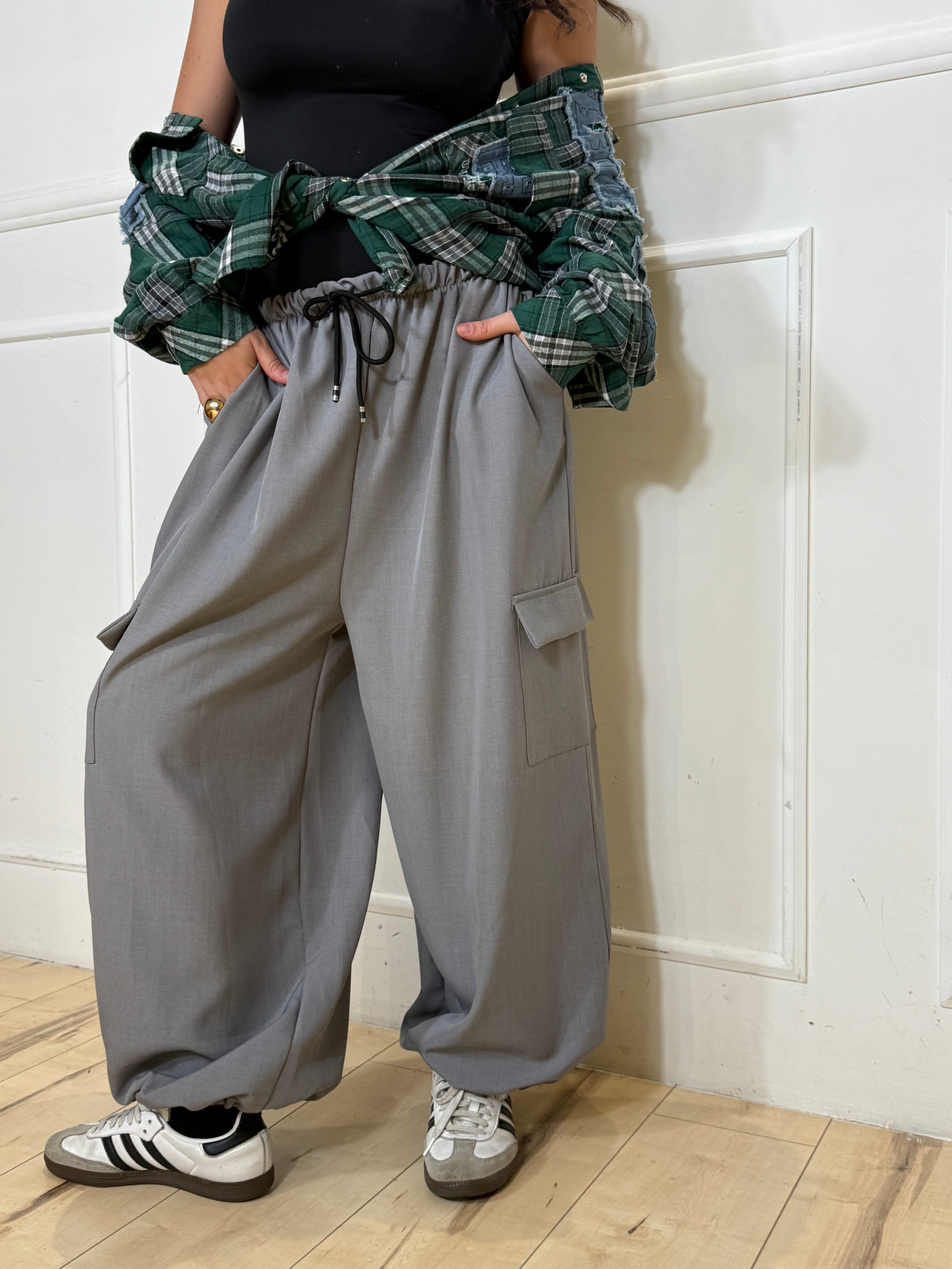 Pantalone cargo con tasconi laterali ed elastico in vita e couliss regolabile sul fondo.