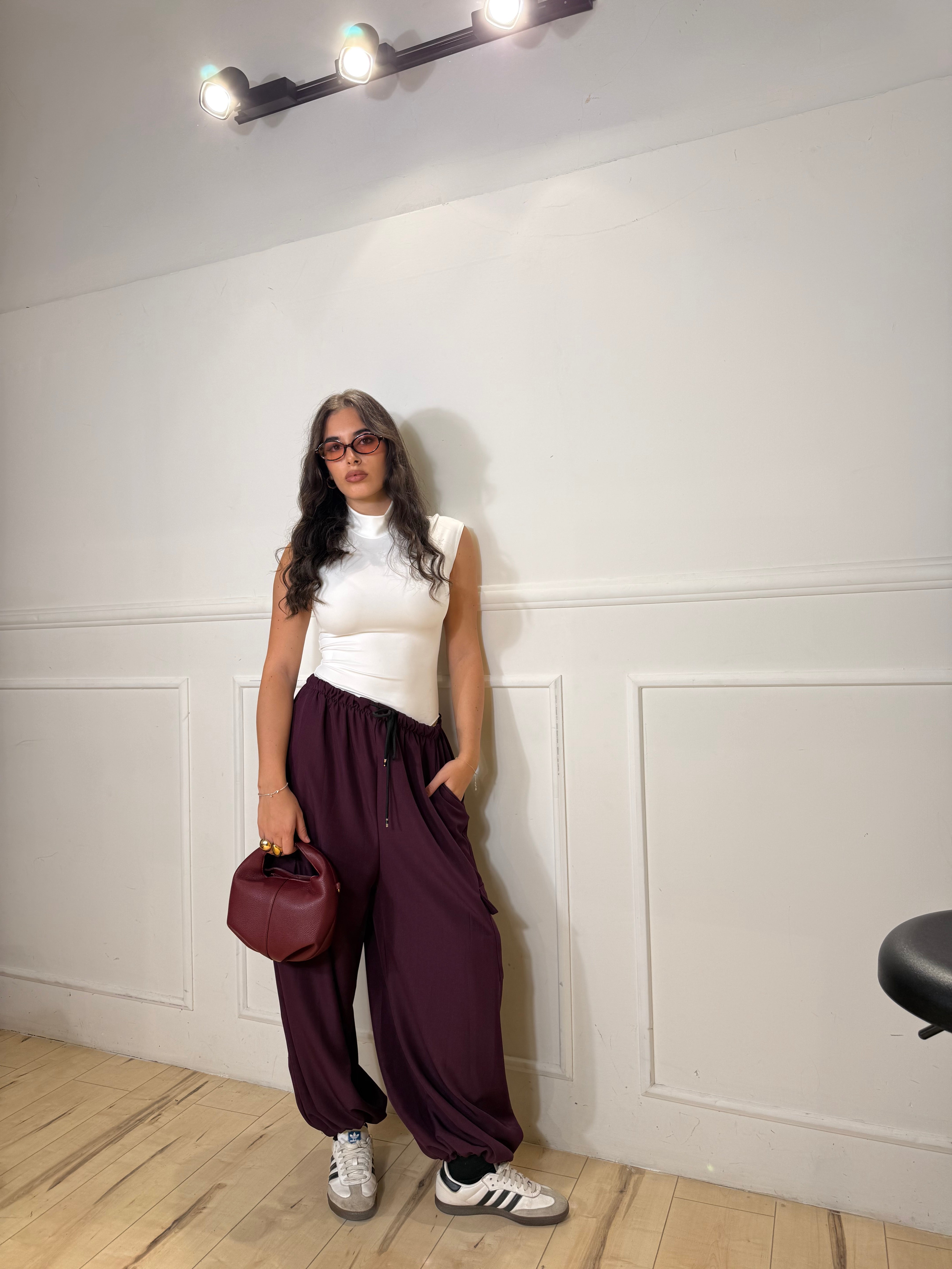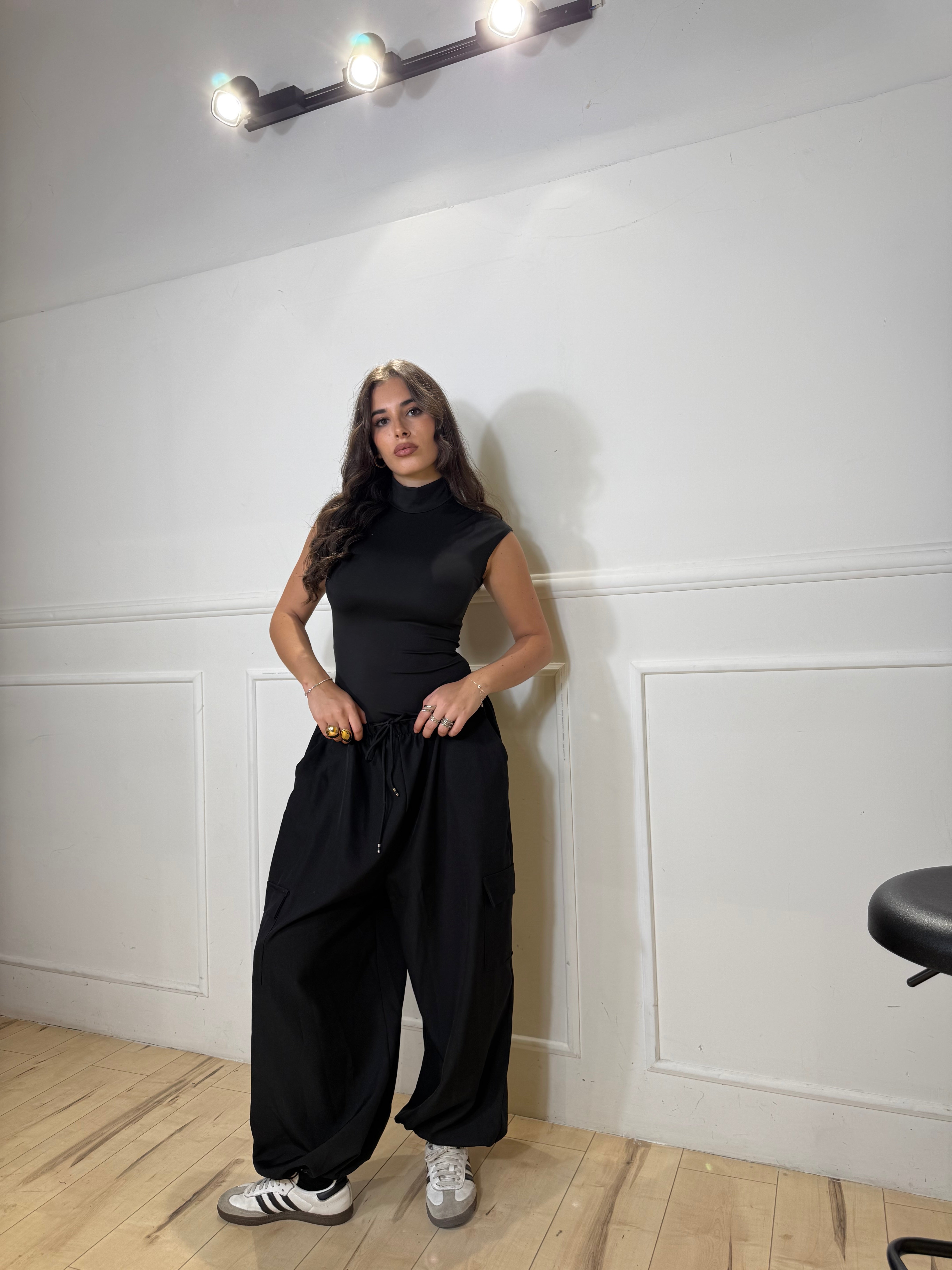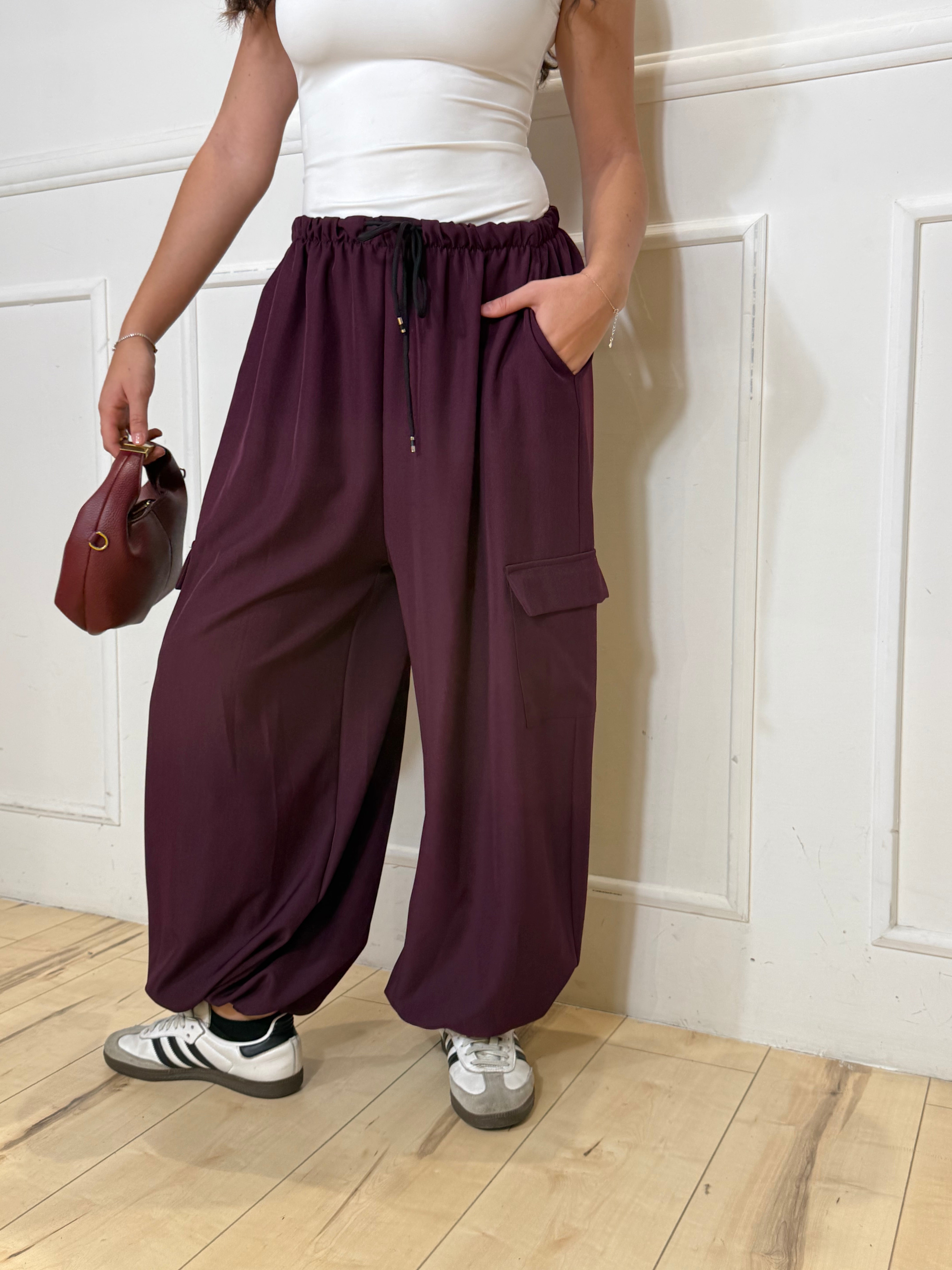 Pantalone cargo con tasconi laterali ed elastico in vita e couliss regolabile sul fondo.