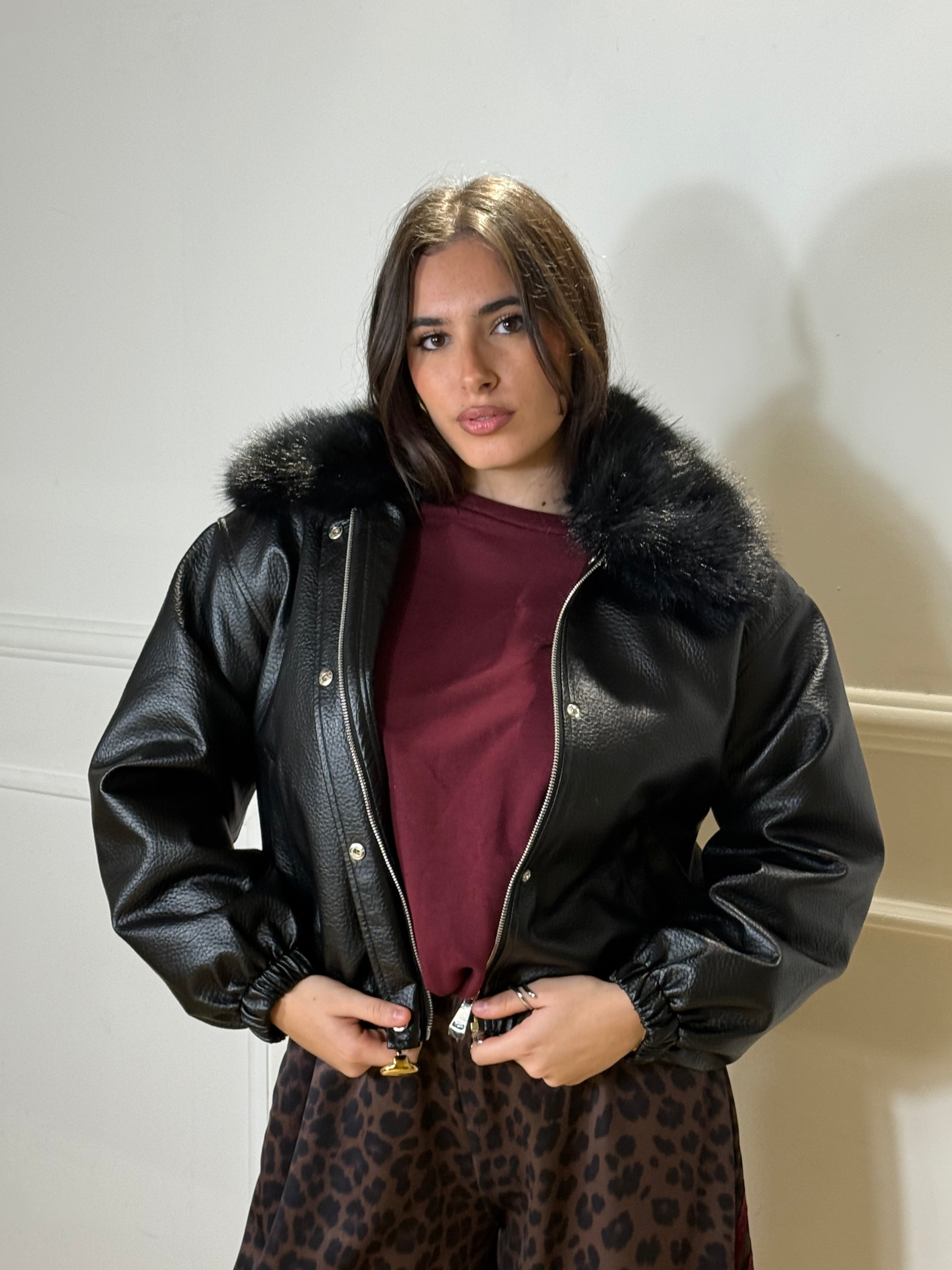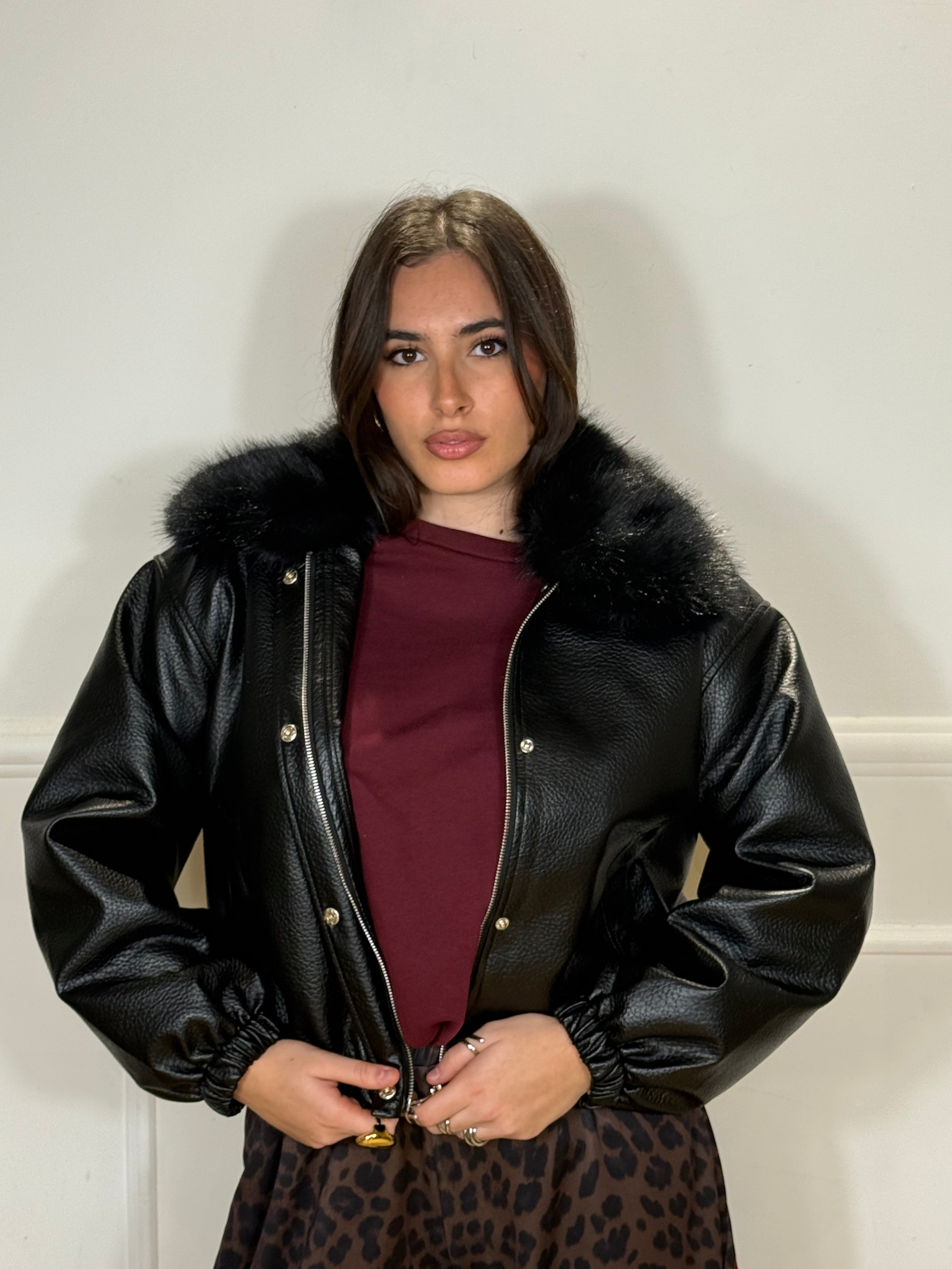 Bomber in pelle morbida imbottito con pelliccia, con collo rimovibile. Disponibile in taglia unica, veste bene fino ad una taglia 48.