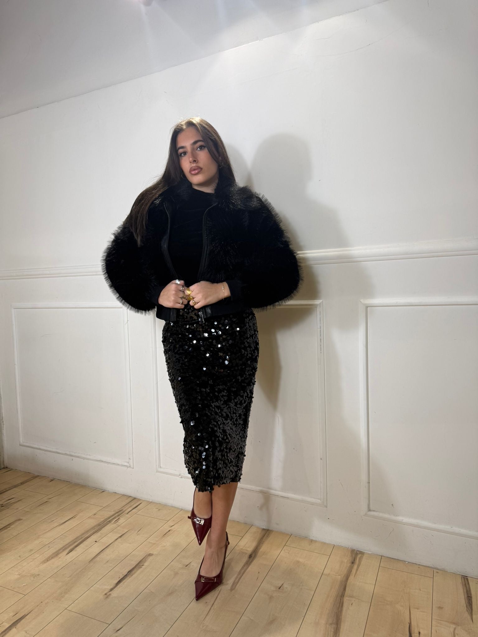 Gonna lunga con paillettes in tessuto elasticizzato. Disponibile in taglie.