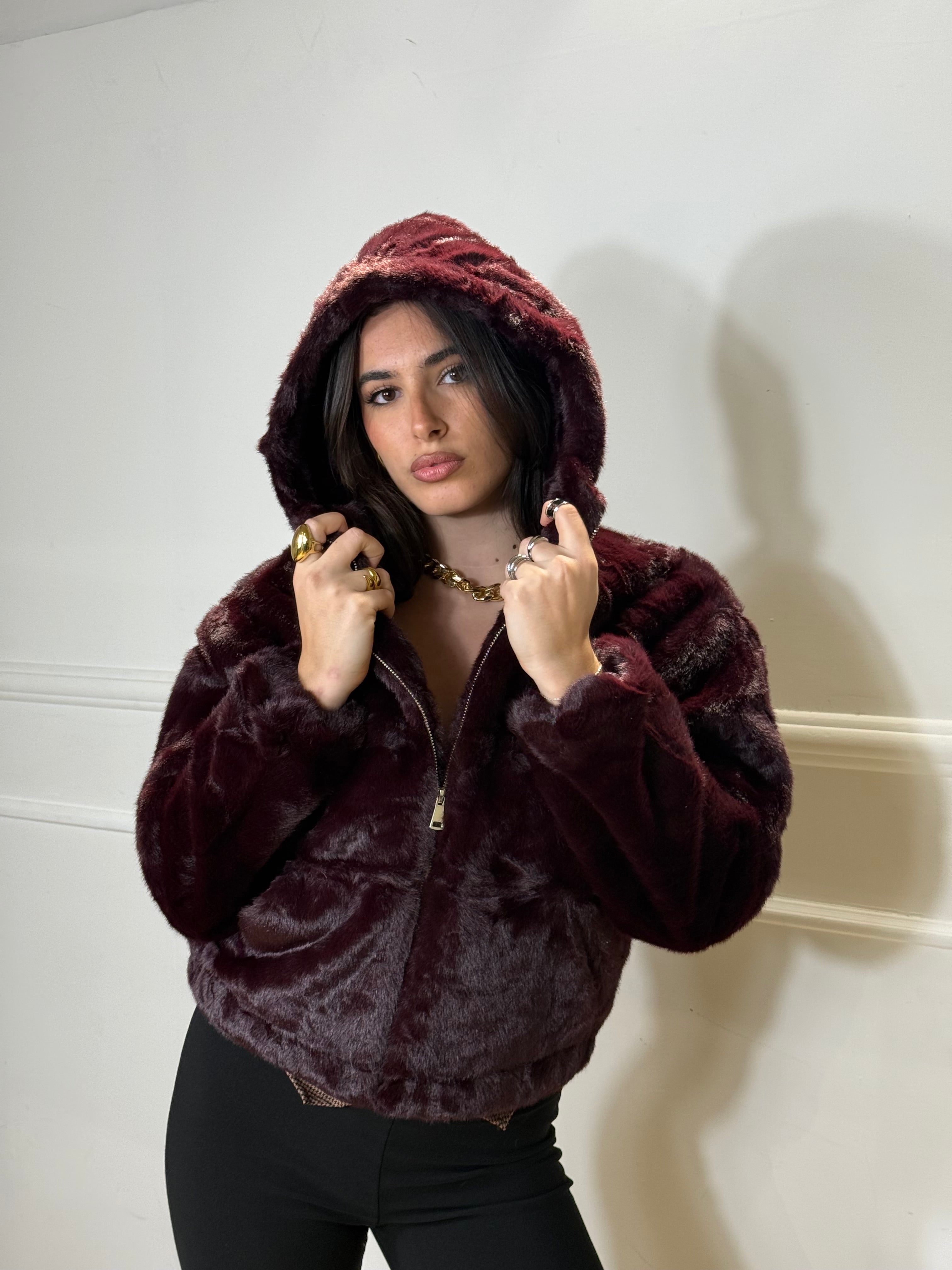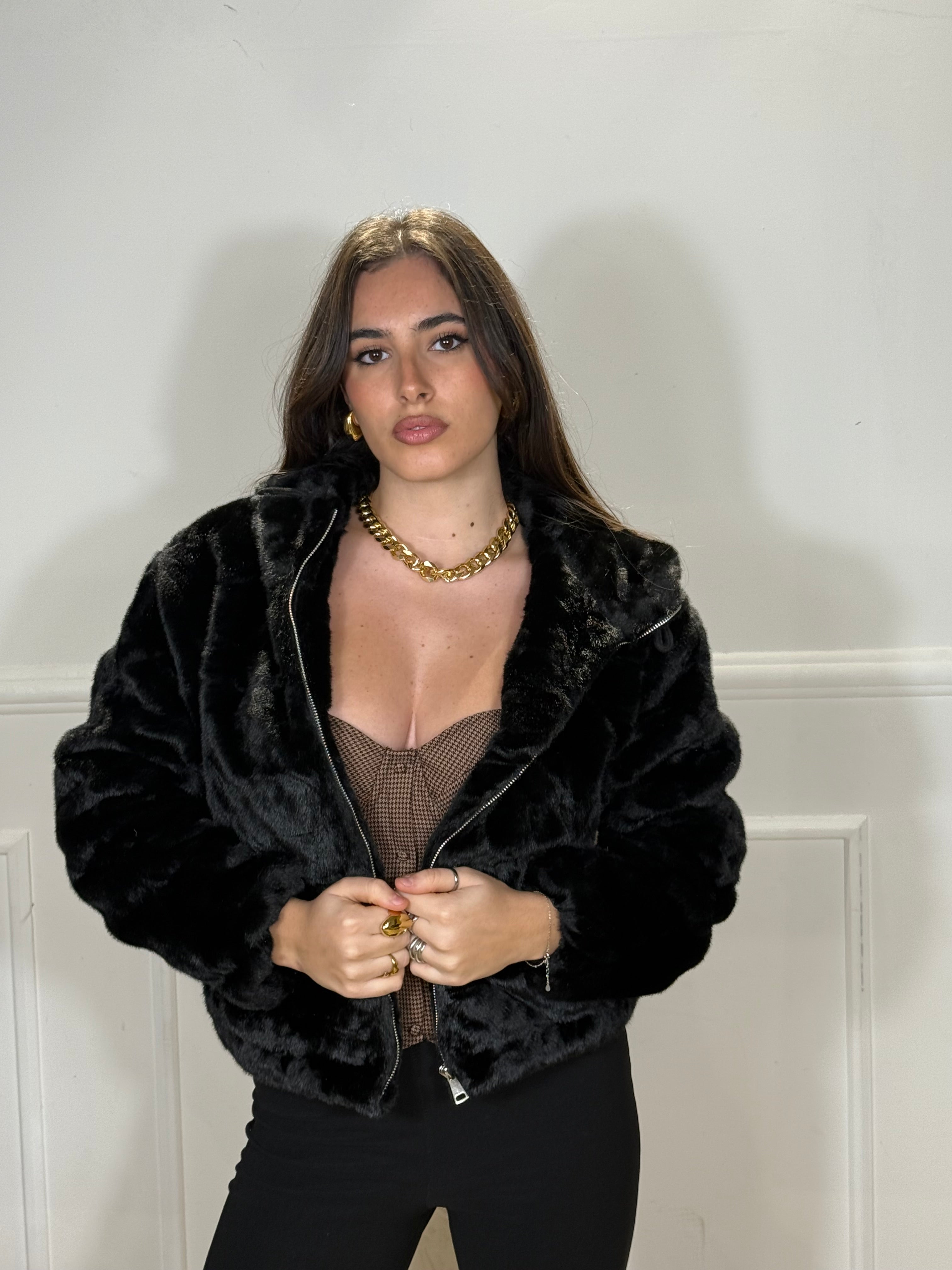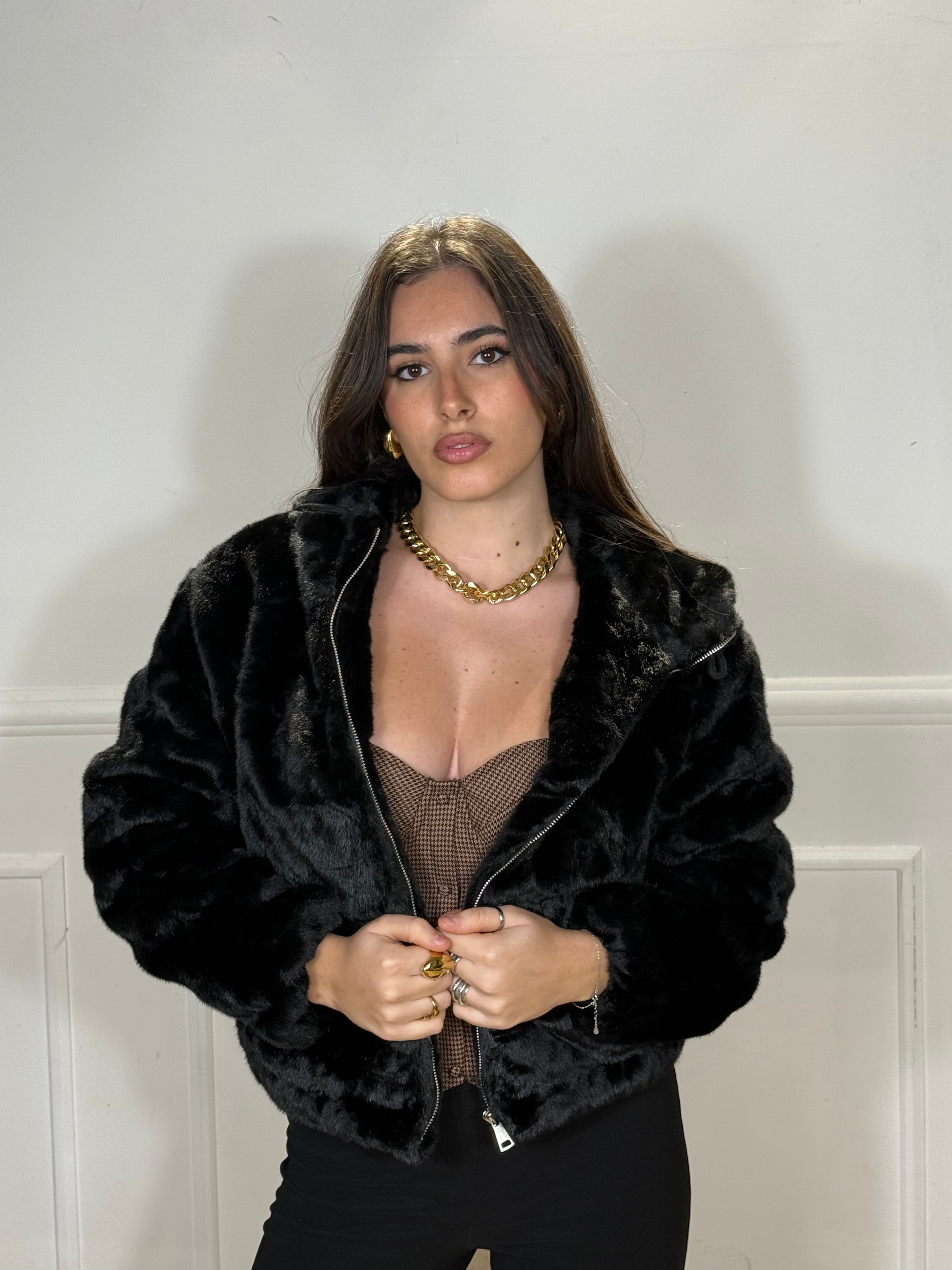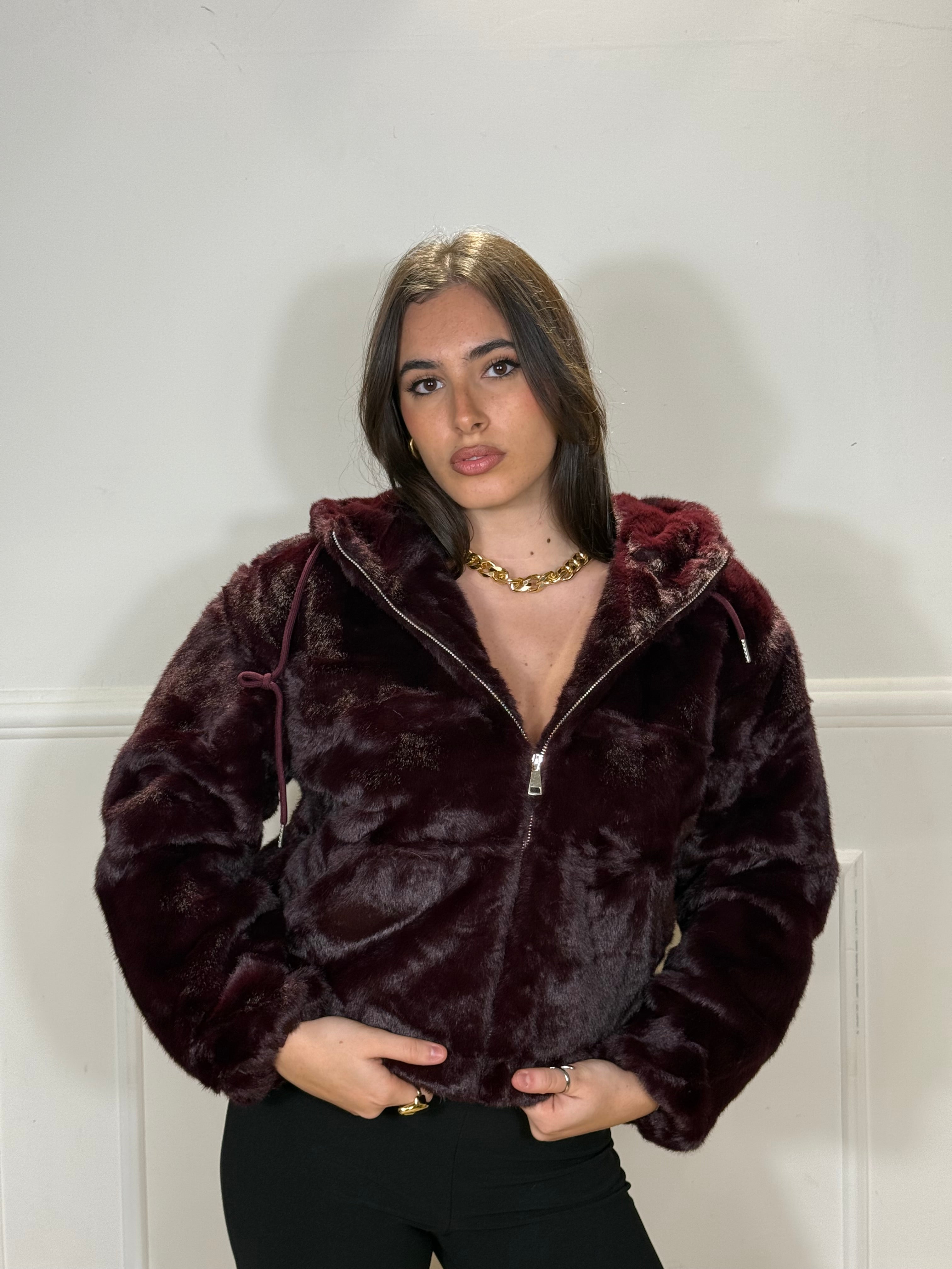 Pelliccia foderata con cappuccio e zip, molto calda. Disponibile in taglia unica, veste bene fino ad una taglia 48.