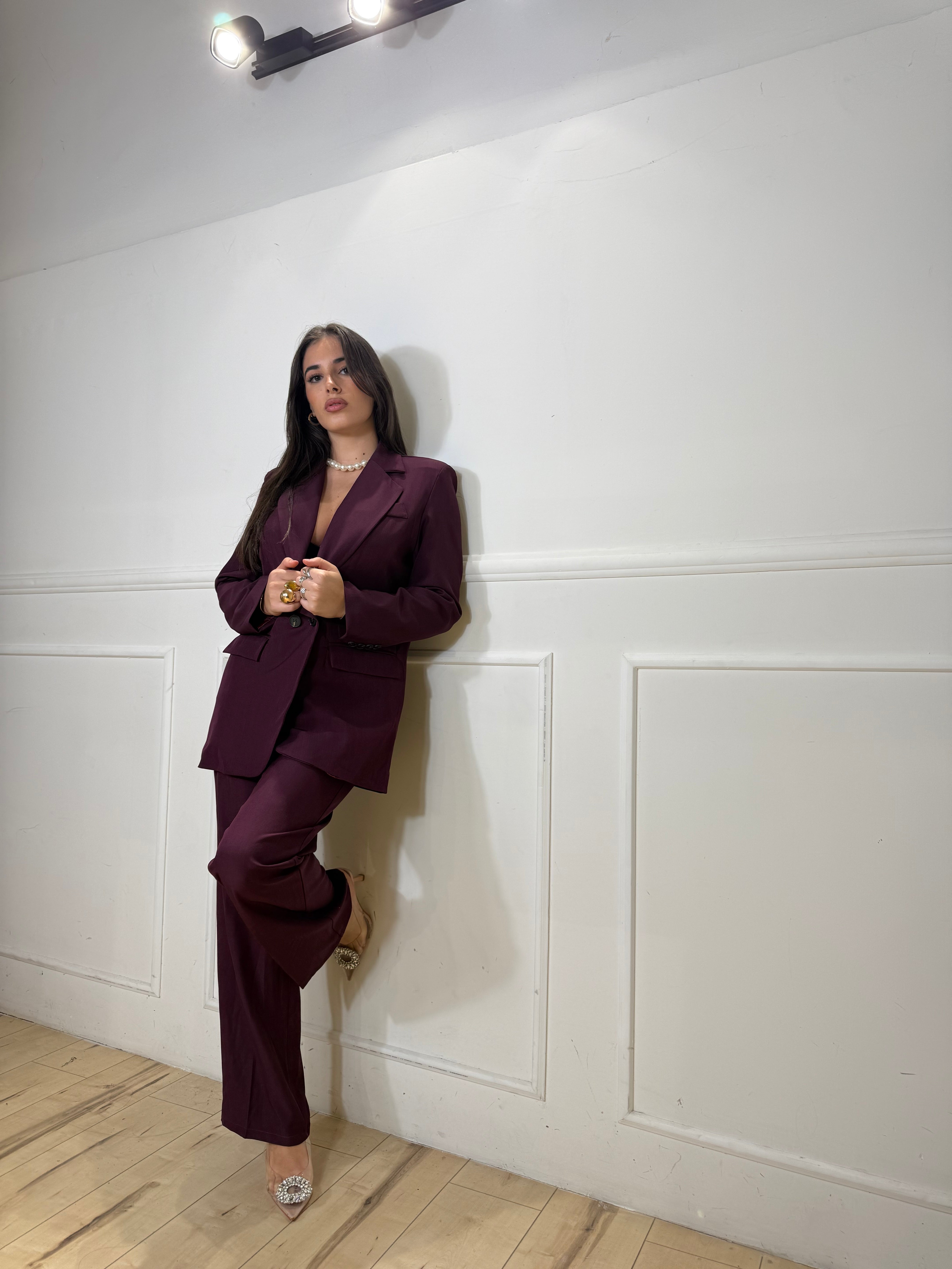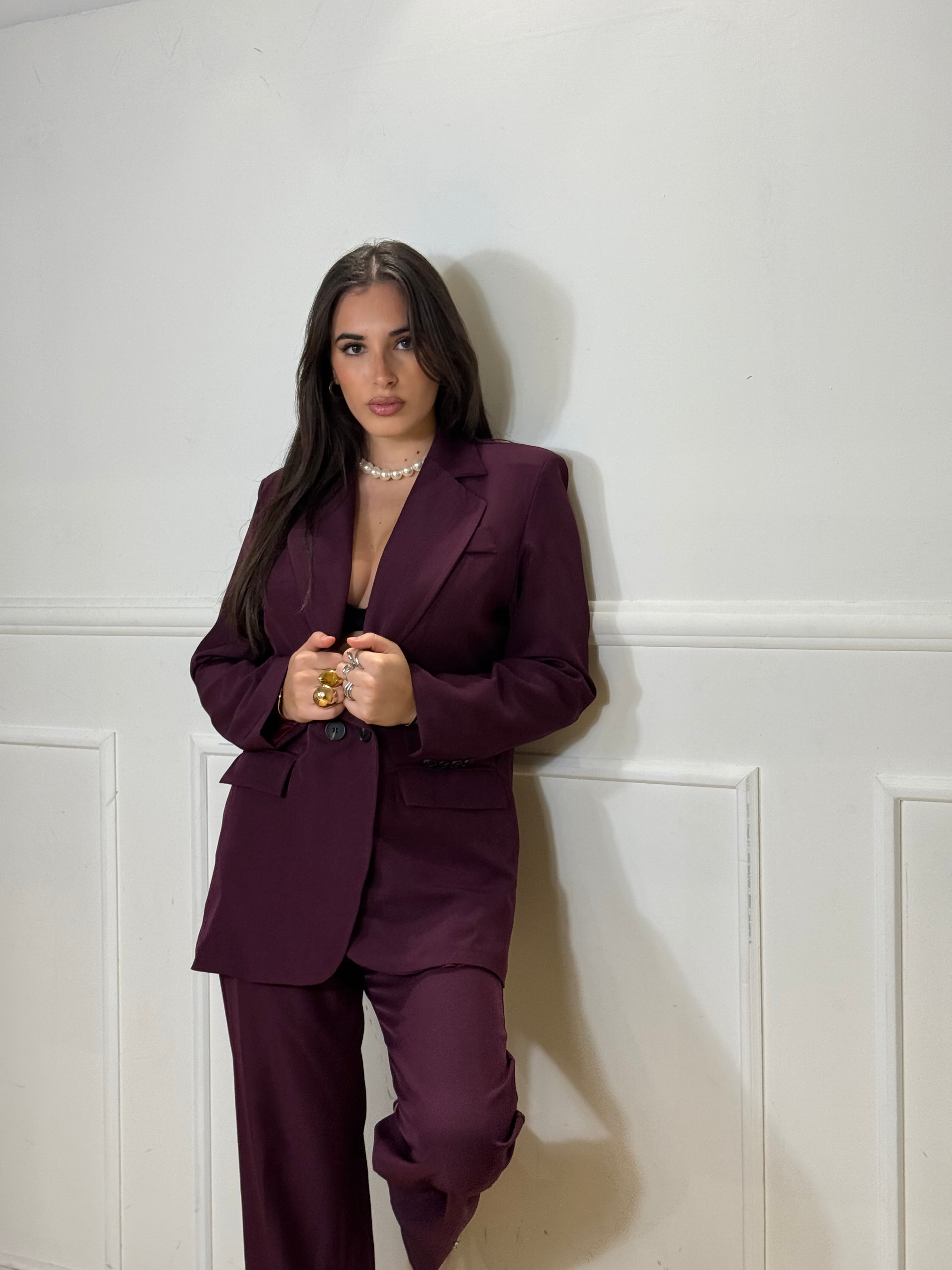 Tailleur composto da pantalone con elastico in vita e giacca over foderata. Disponibile in taglia unica, veste bene fino ad una taglia 48.
