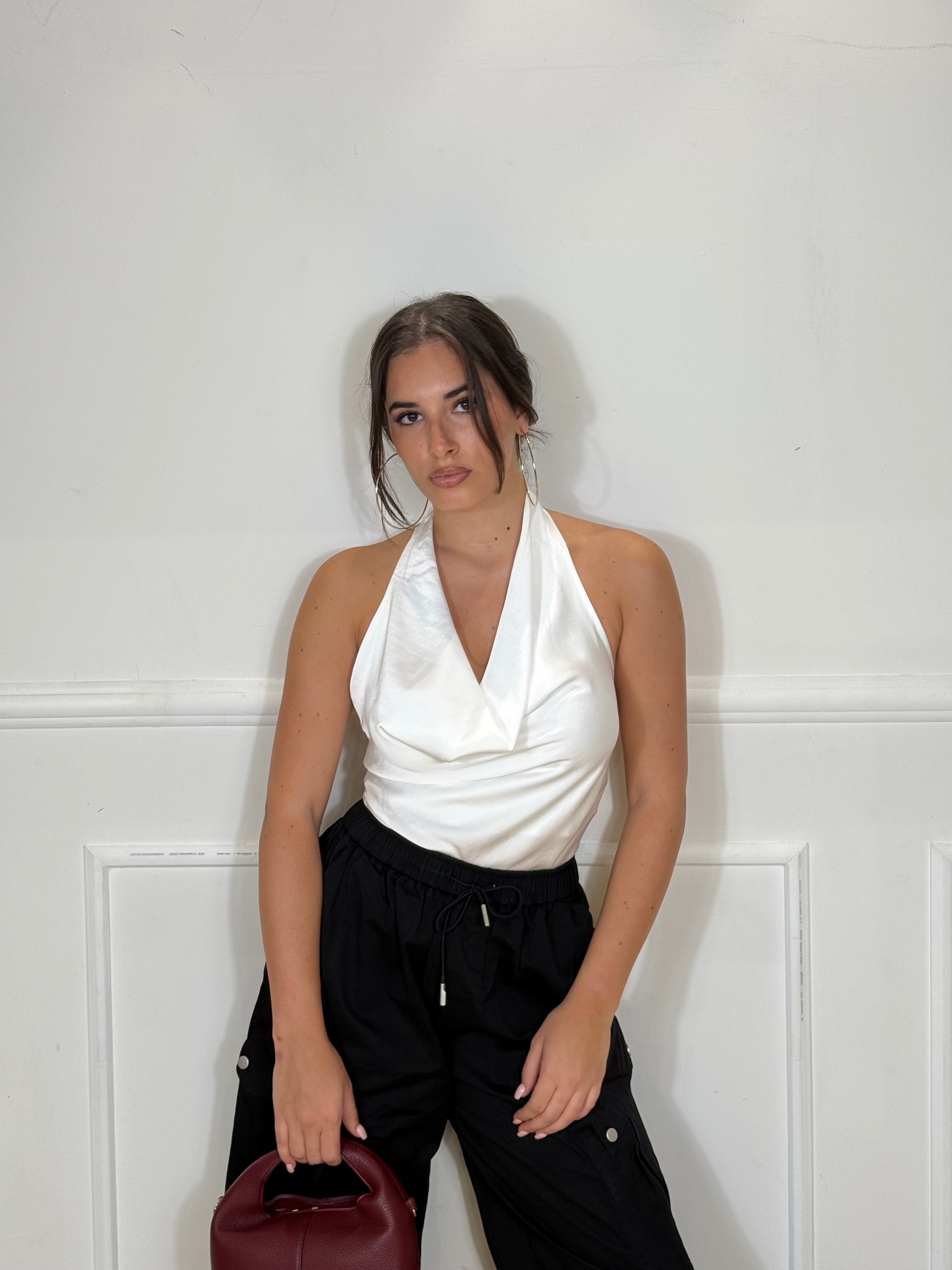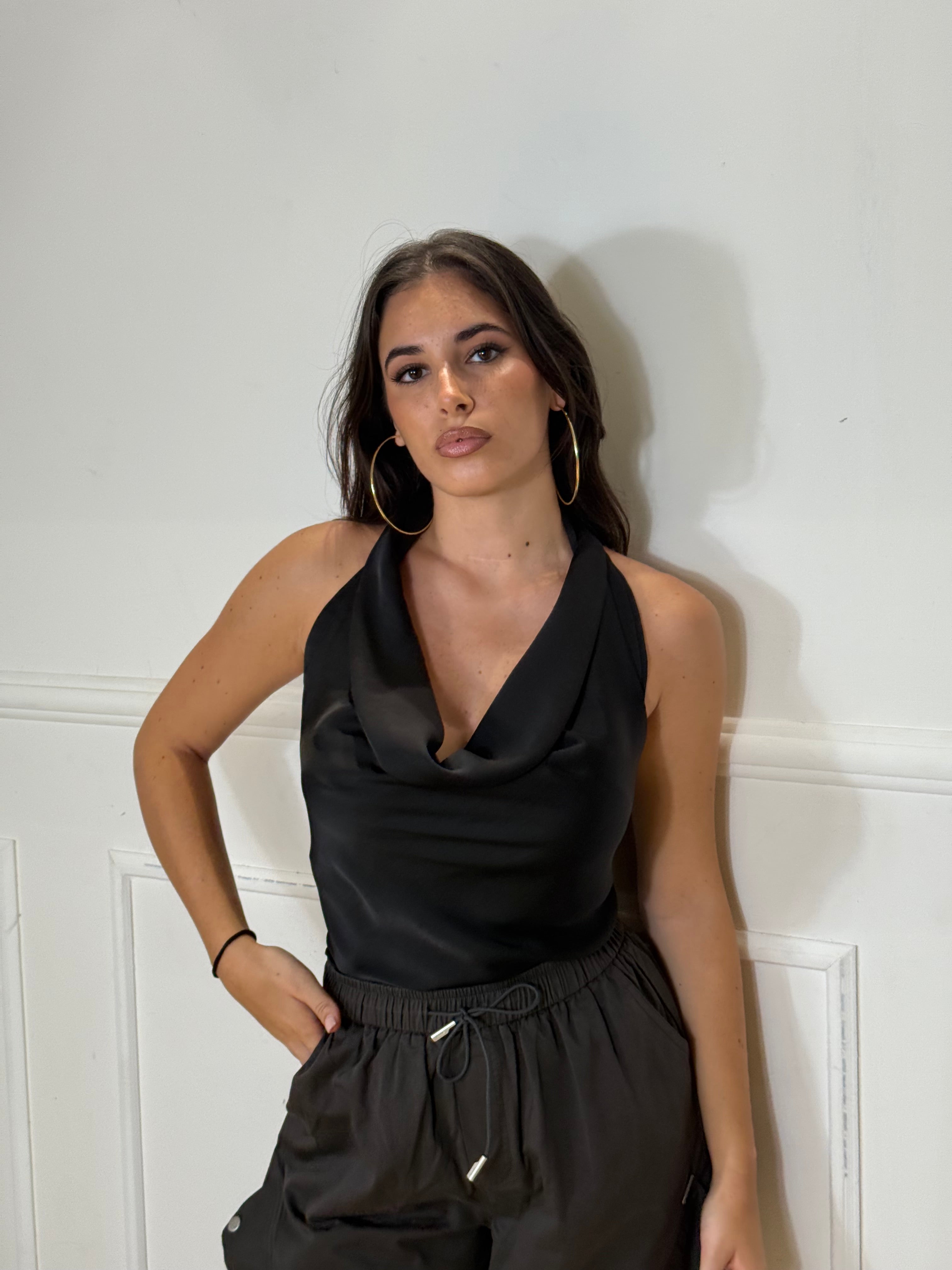 Top in raso regolabile sul collo e dietro la schiena. Disponibile in taglia unica.
