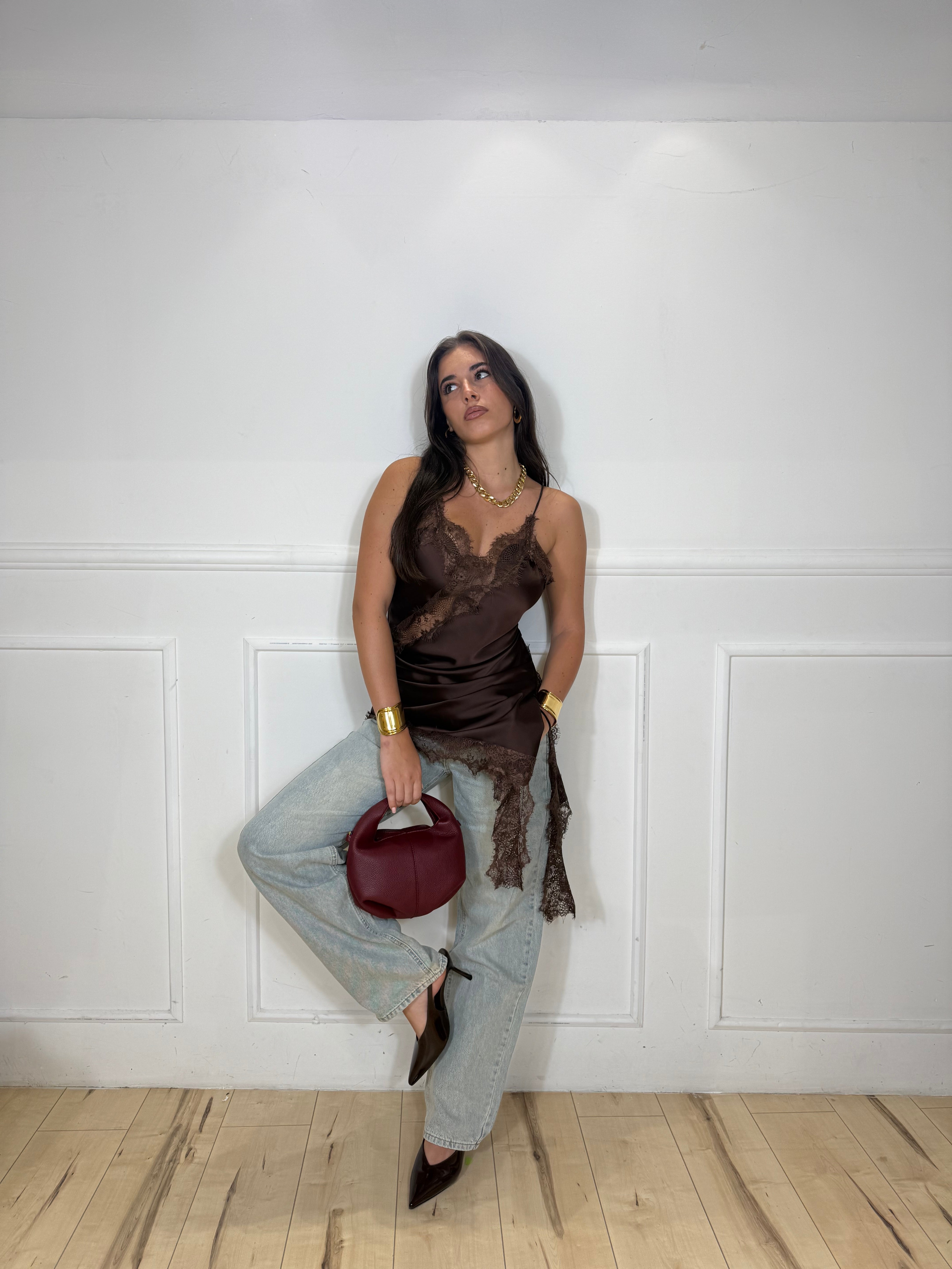 Abito asimmetrico in raso e merletto, disponibile in taglia unica.